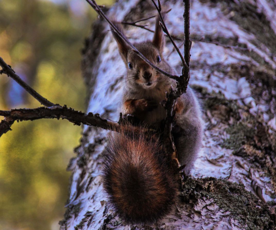 На фотографии белка, которая свысока наблюдает за фотографом.
