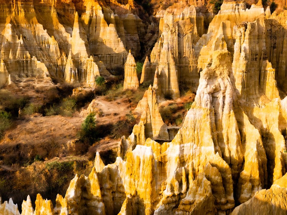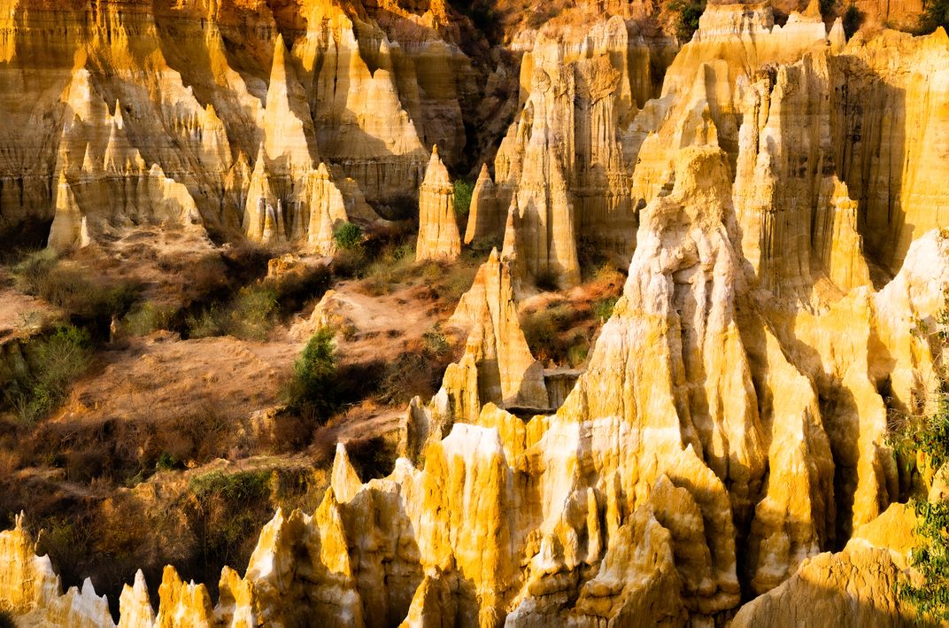 位于中国云南省元谋的土林群,是由砂子和粘土加上少量的钙质胶结物组成,又由于当地其特殊的地质和气候环境,经过两百万年地质变化而逐步形成的。土林群在阳光映射下,金碧辉煌非常壮观。