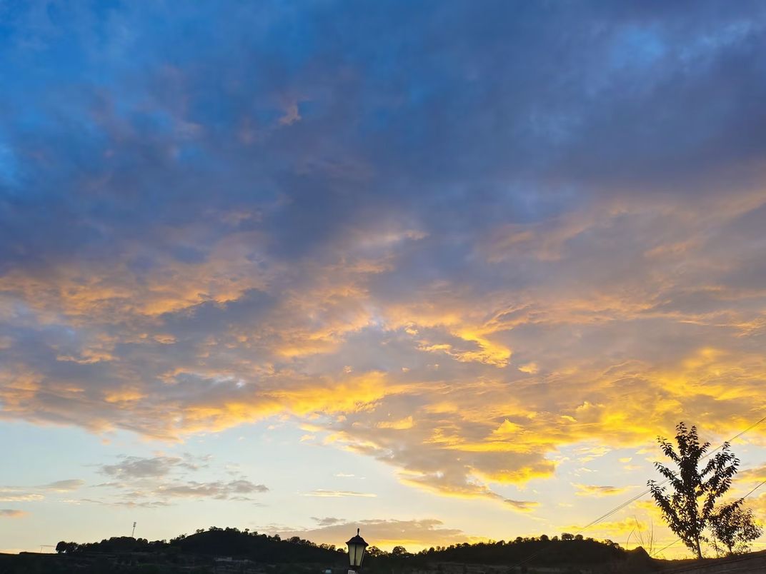 这张照片是一个自然风景,也算是我的一次旅行。在我吃完晚饭,出门散步被这次金灿灿的天空所吸引,拍摄记录下来的。