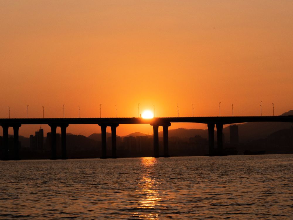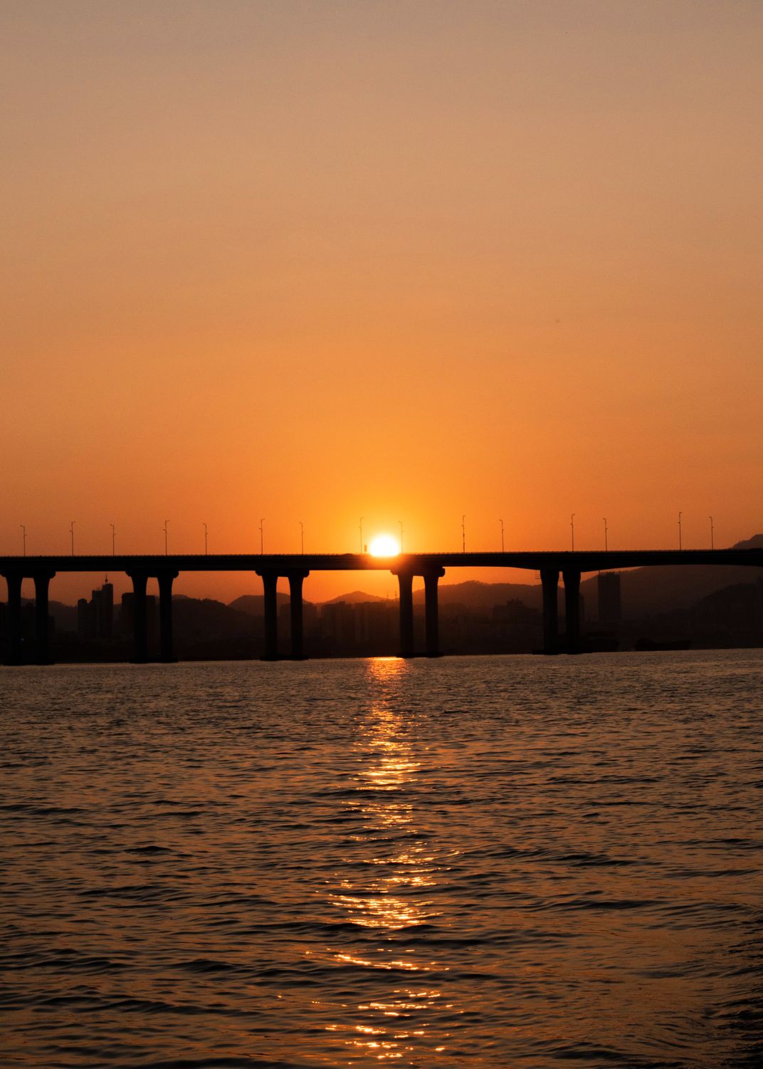 桥梁,河水,日落,大山,在这一刻,都落到了刚刚好的位置
