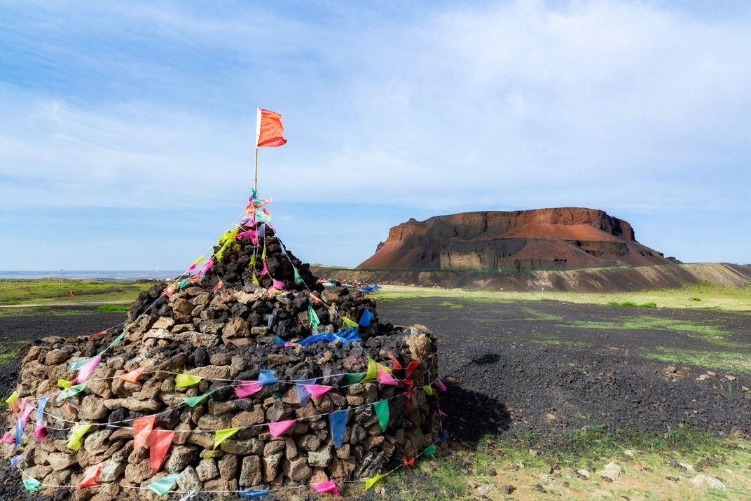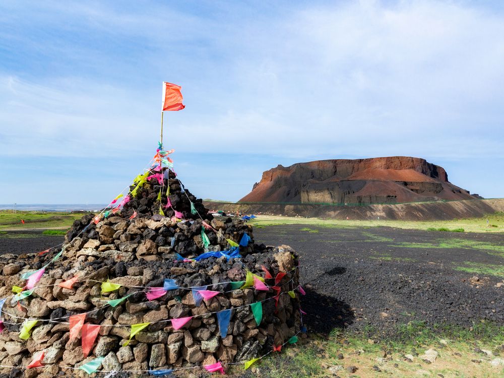 火山石堆砌成的敖包与远处的火山交相辉映