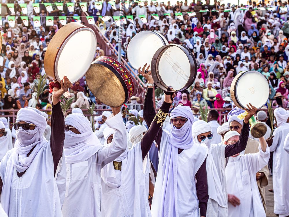 الصورة توثق لحظة جماعية من الفلكلور الشعبي الصحراوي الجزائري، حيث يجتمع رجال يرتدون اللباس التقليدي الأبيض ويرفعون الدفوف عاليًا وسط حشود كبيرة. المشهد يعكس روح الجماعة، التراث الموسيقي، والهوية الثقافية المتجذرة في الصحراء.