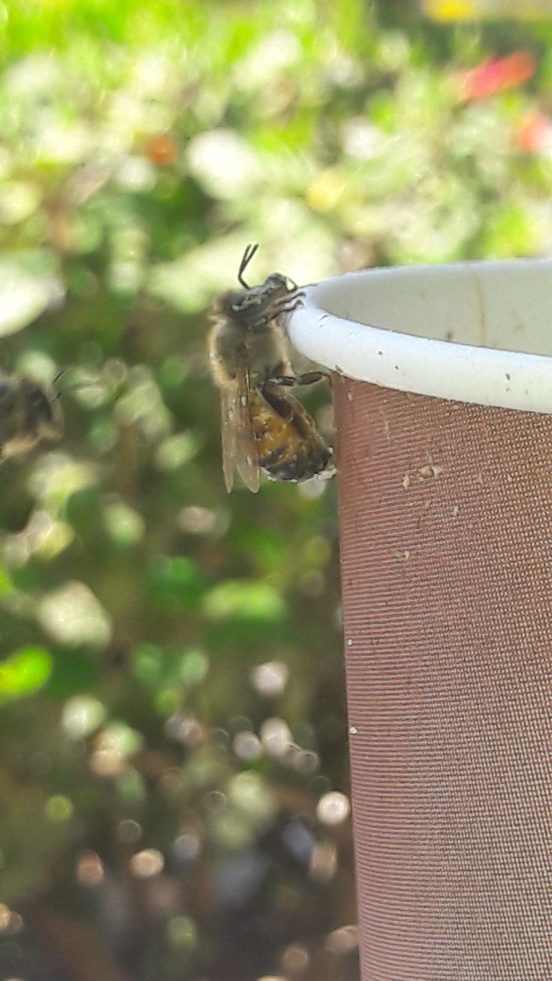 كنت جالسا في الجامعة اتناول وجبة افطاري فجائة هذه النحلة ووقفت علي كاس الشاي وقد رايتها منظرا جميلا وقمت بتصويرها بعدسة الجوال
