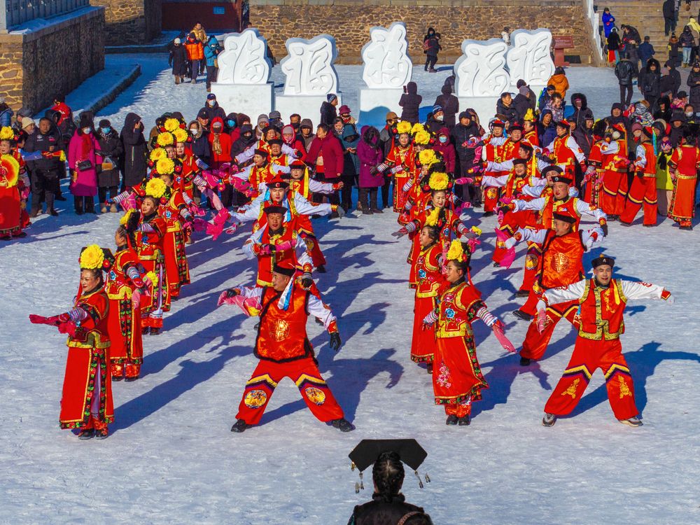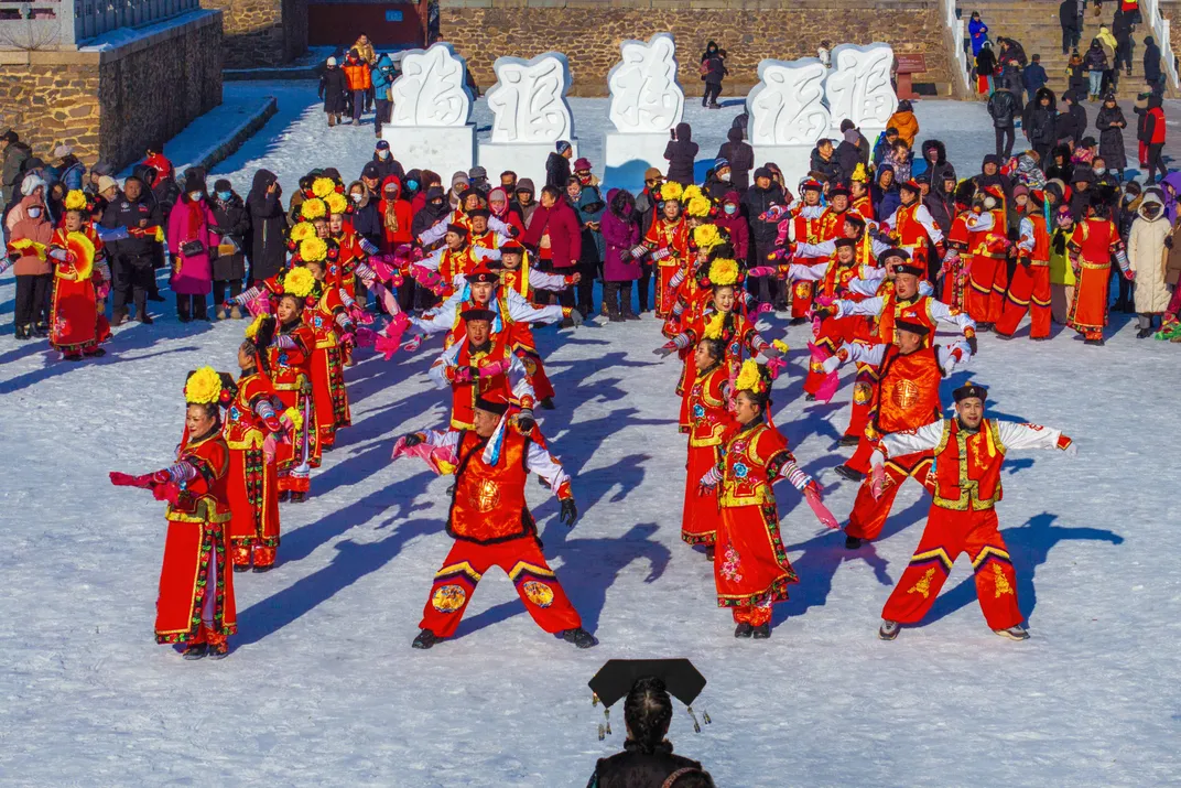 Work was photographed in Fushun, Liaoning, on January 11, 2025. In the old city square, the villagers Hetuala Village dressed in Manchu costumes and danced the Manchu National Intangible Cultural Heritage Project, which attracted many spectators.