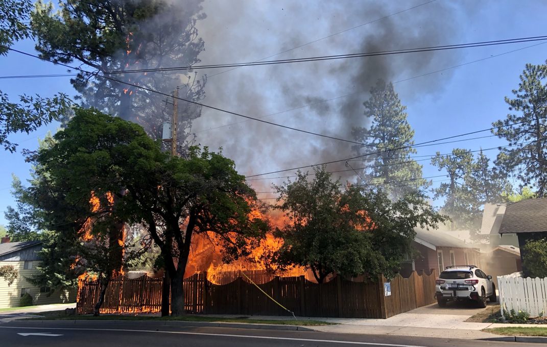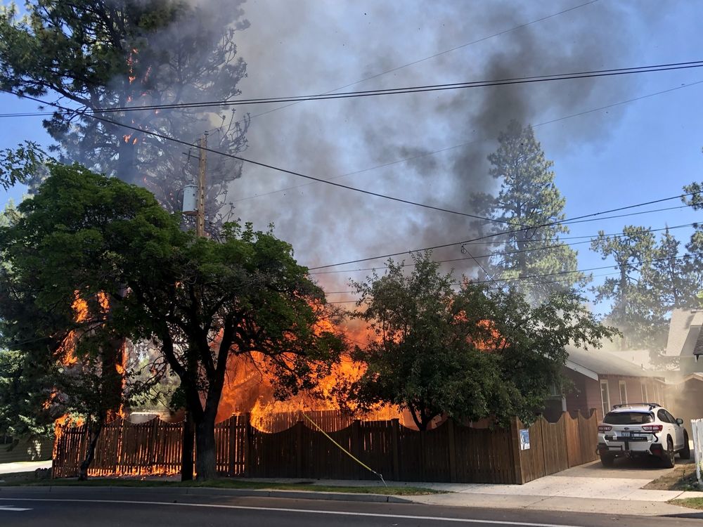 House fire in Bend, OR, in the middle of summer. Two houses and a large pine tree were involved. No injuries. Hot and dry conditions made this situation explosive.