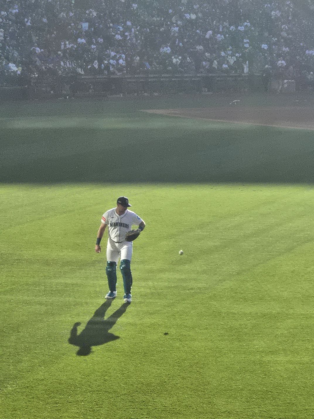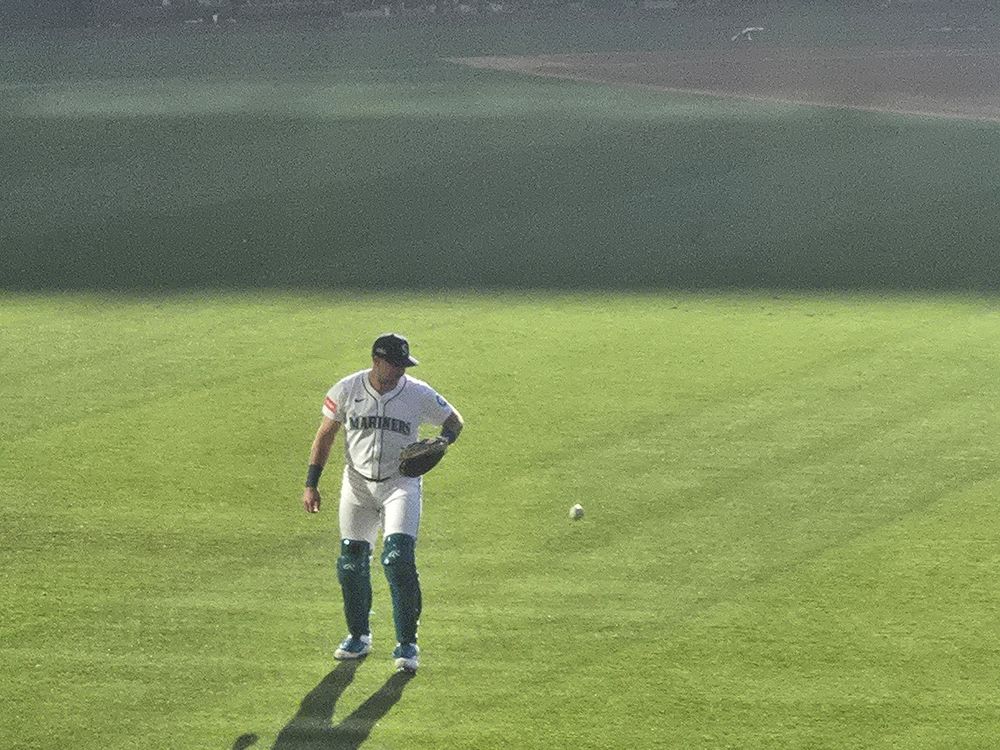 A photo of the Seattle Mariners pregame warmups in the 2025 ALDS Series. The best catcher of all time: Cal Raliegh.