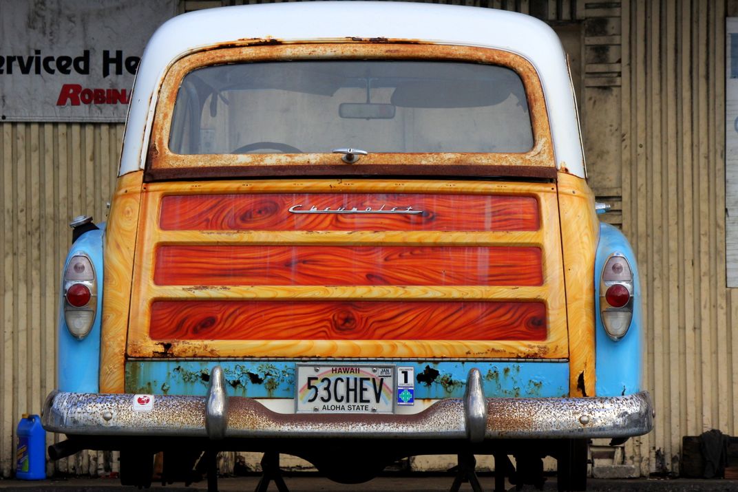 I noticed this classic old American car, still elegant despite wear and tear, waiting to be restored to its former glory in an auto shop.