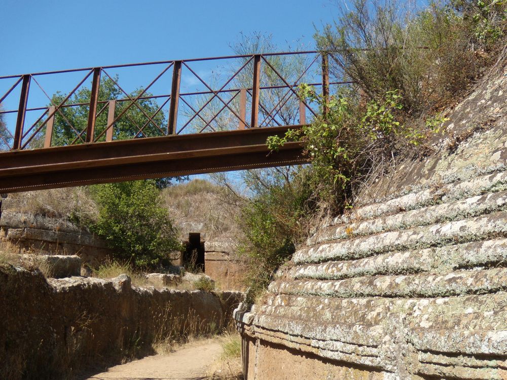 6th Century Etruscan tomb and steel bridge (suspended 10 feet in the air) leading in to the entrance of the tomb.