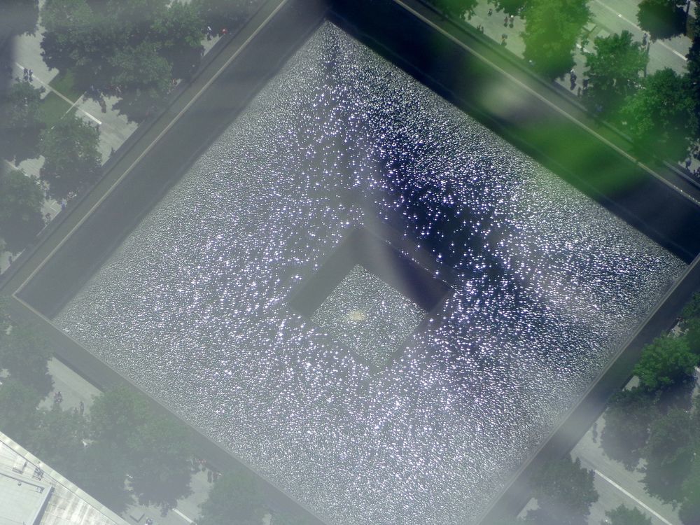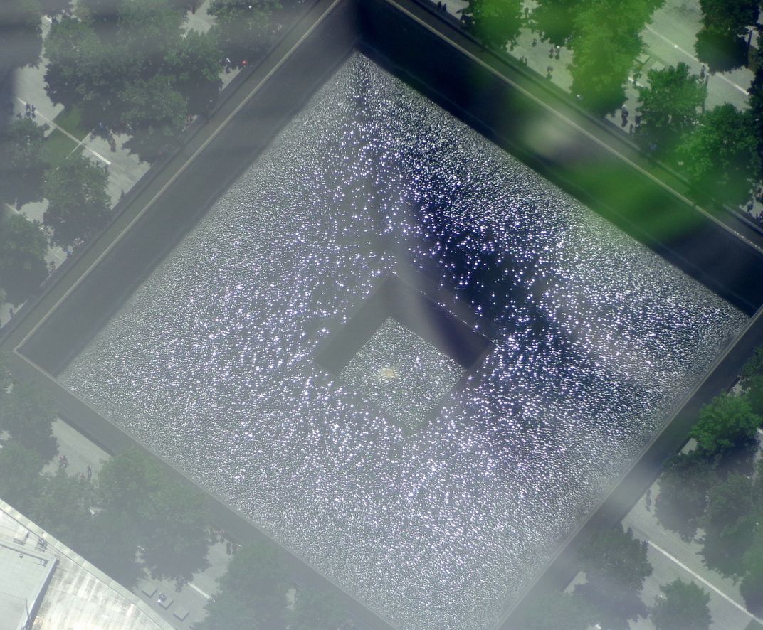 Looking down at the 9/11 Memorial waterfalls and reflecting pool from the observation deck of the Freedom Tower, One World Trade Center.