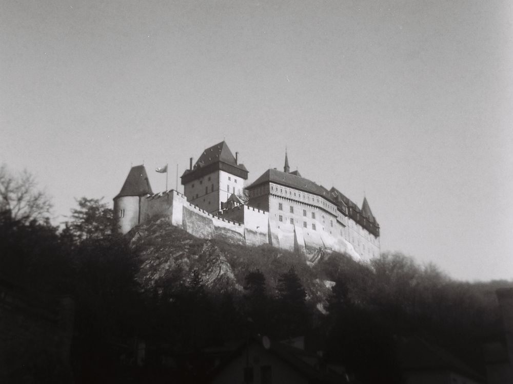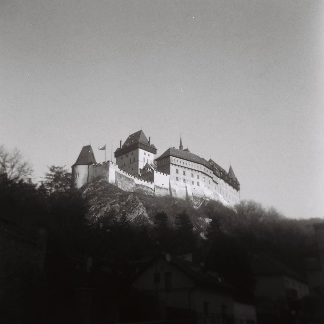 Karlstejn Castle from the main street of the village. Backdrop of an immaculate clear day in the wintertime.