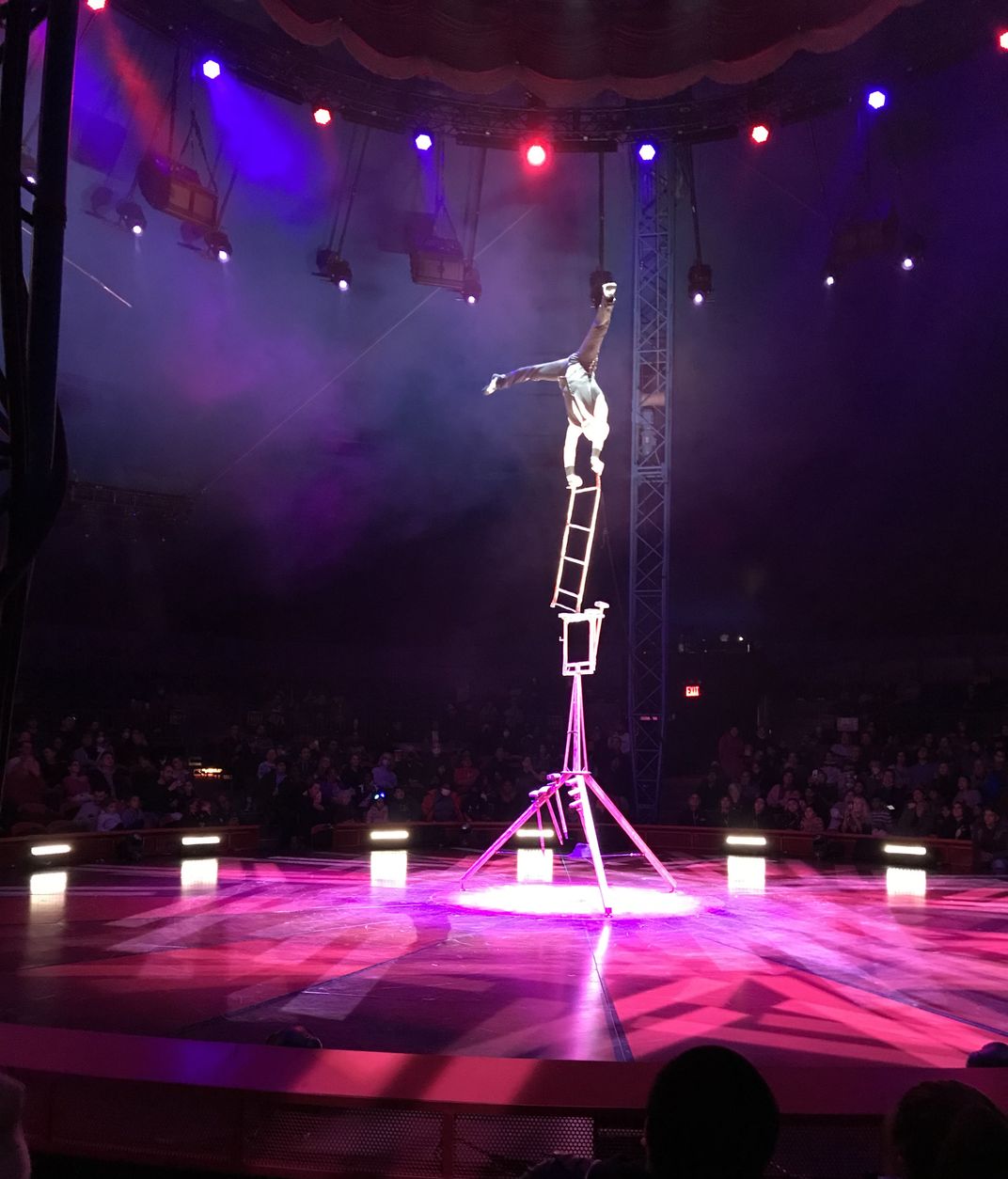 At the Big Apple Circus in New York City, the audience waits with bated breath as the performer climbs the ladder to success.