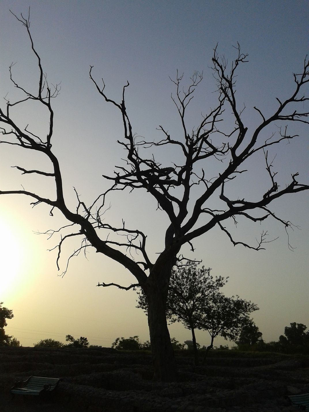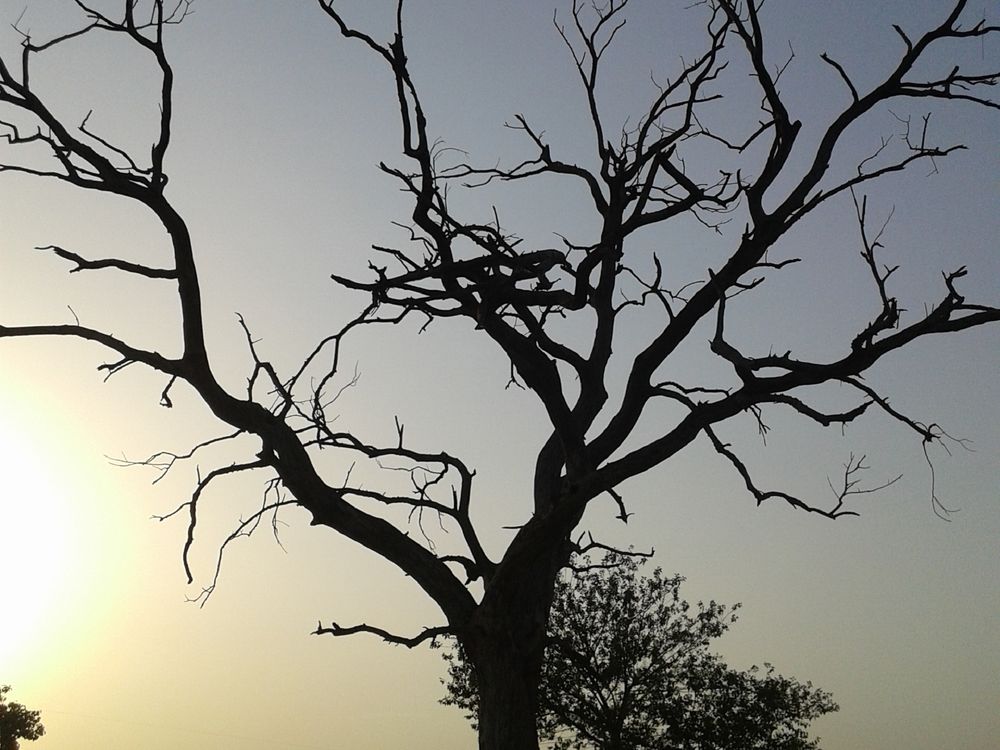 A bare tree silhouette at sunset