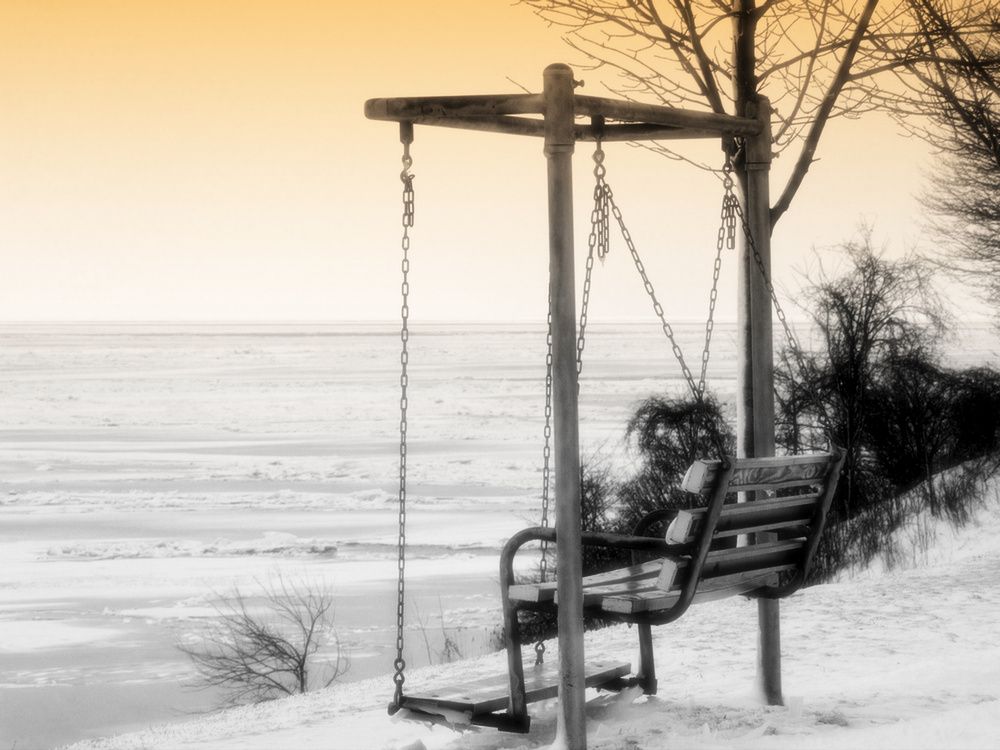 A beach swing on a quiet winter afternoon on Lake Erie near Cleveland, OH. The hush of the day is personified by the swing and landscape, as it waits for summer.