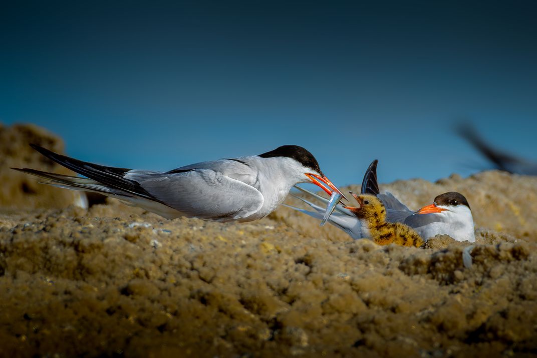 “A Beak that Kills to Give Life” captures a tern feeding its tiny chick as the mother watches tenderly from behind — a touching moment that reveals the balance of strength and compassion in the wild.