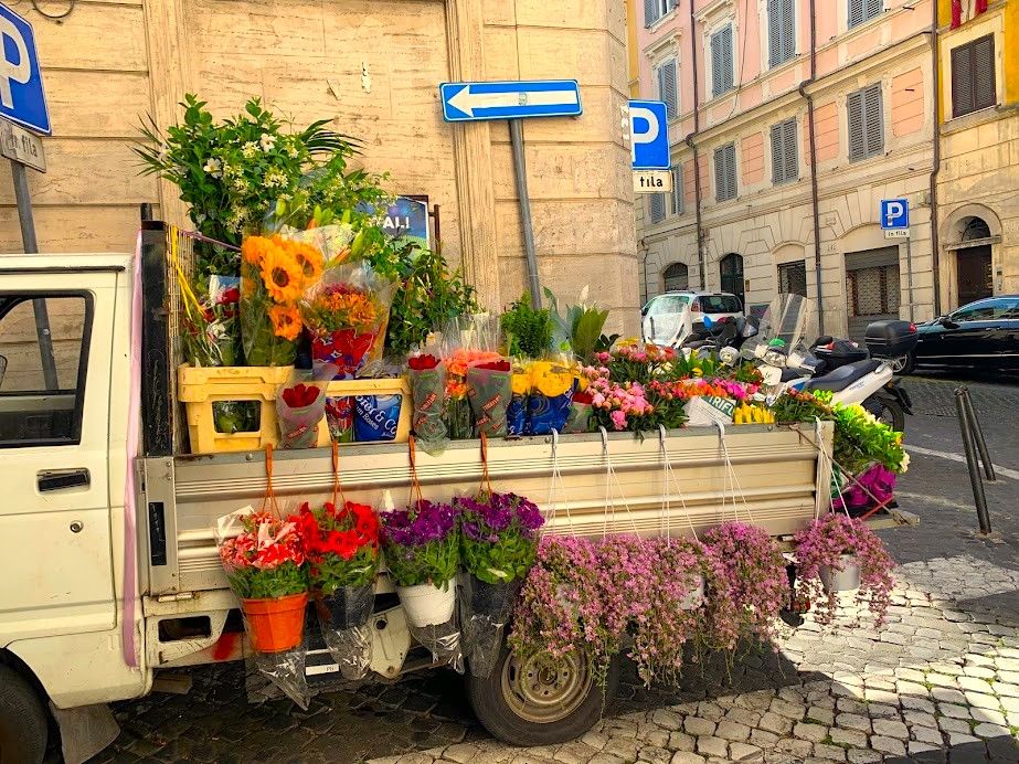 A morning delivery truck bursting with colorful flowers on a Roman street in the Monte Rione quarter.