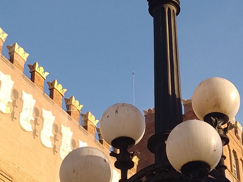 The photo is showing a lamp with four spheres in Citadel park in Barcelona. The upper part of it represents a column with a helmet and some other interesting elements on the top. There is a pigeon inside the helmet.