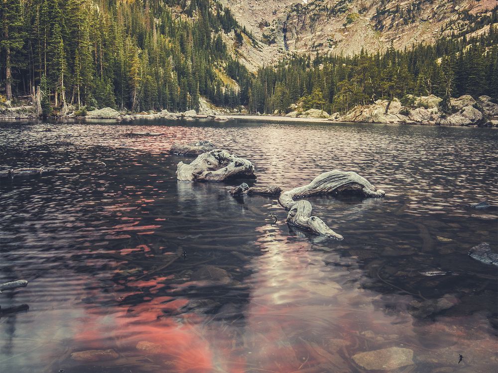 A beautiful sunset over Dream Lake in Rocky Mountain National Park