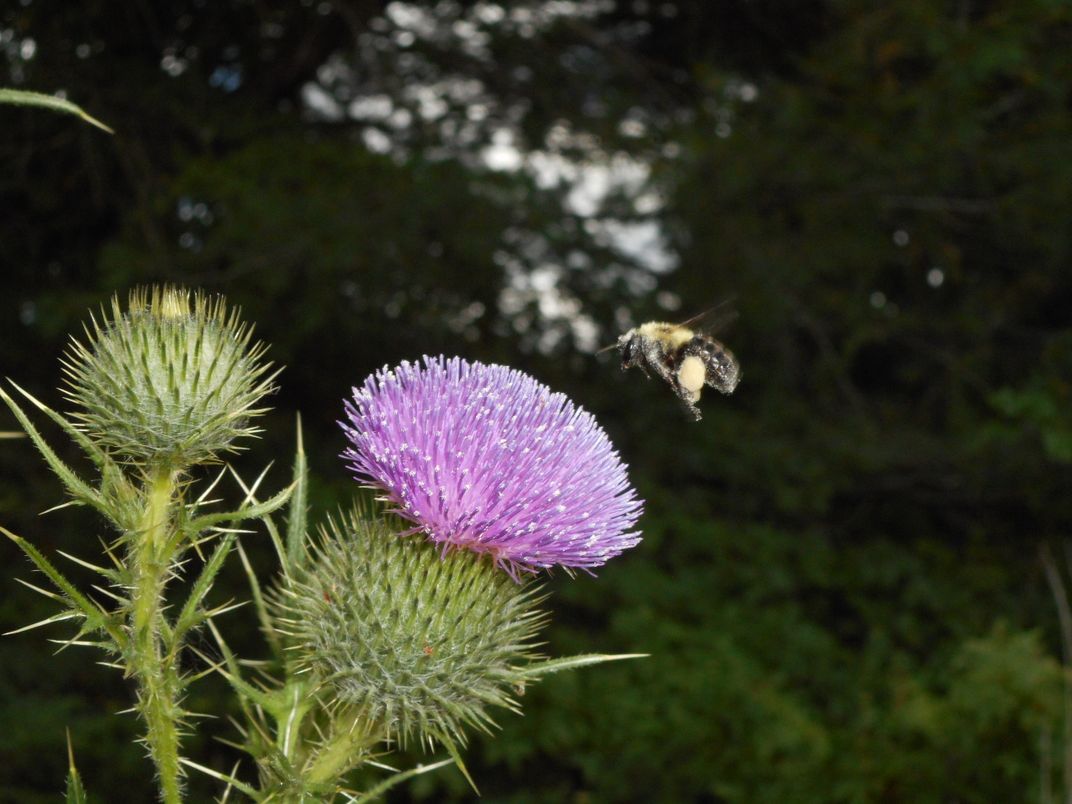 This is a bee collecting nectar, covered in pollen, hovering over a Thistle blossom.