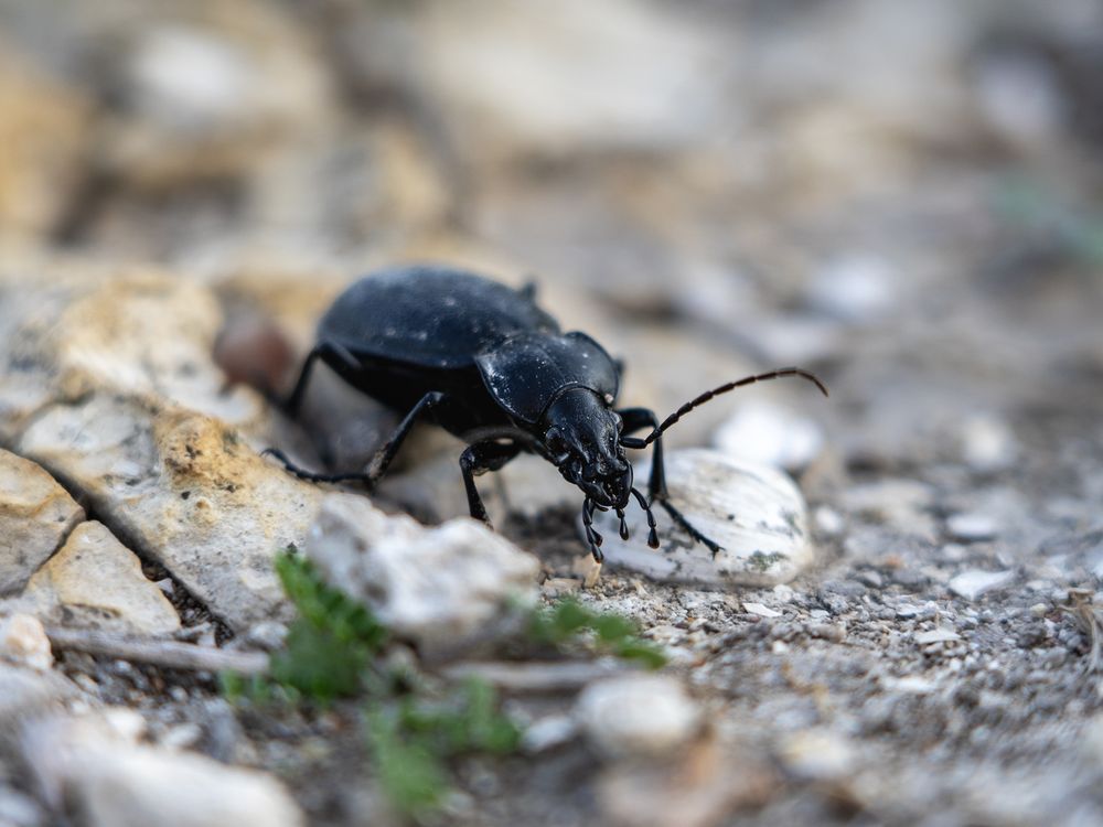 A close-up photo of a black beetle crawling on rocky ground. The insect’s shiny body and long antennae stand out sharply against the blurred background of stones and soil.
