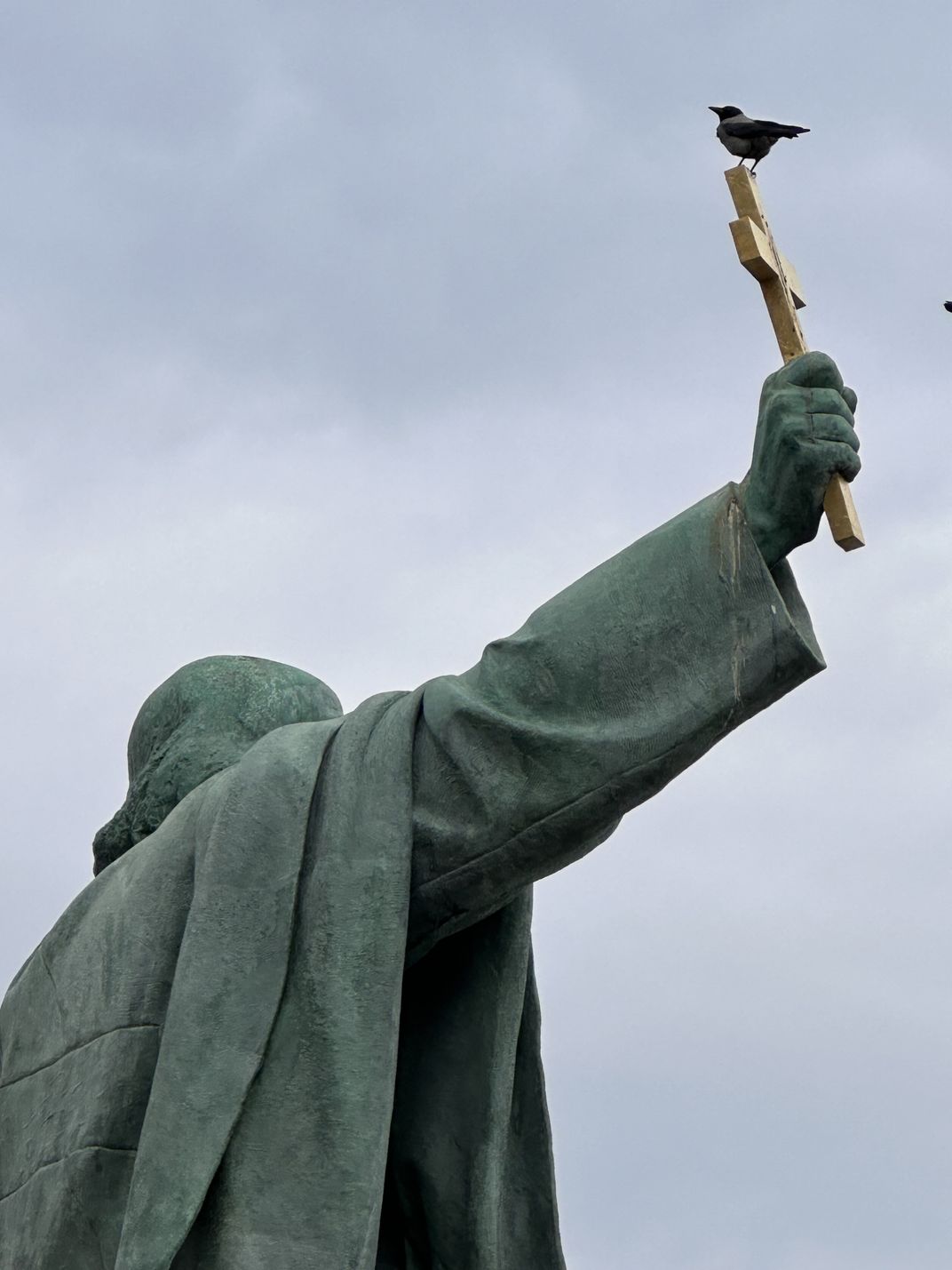 I was walking down the mountain in Budapest and saw this bird on the cross