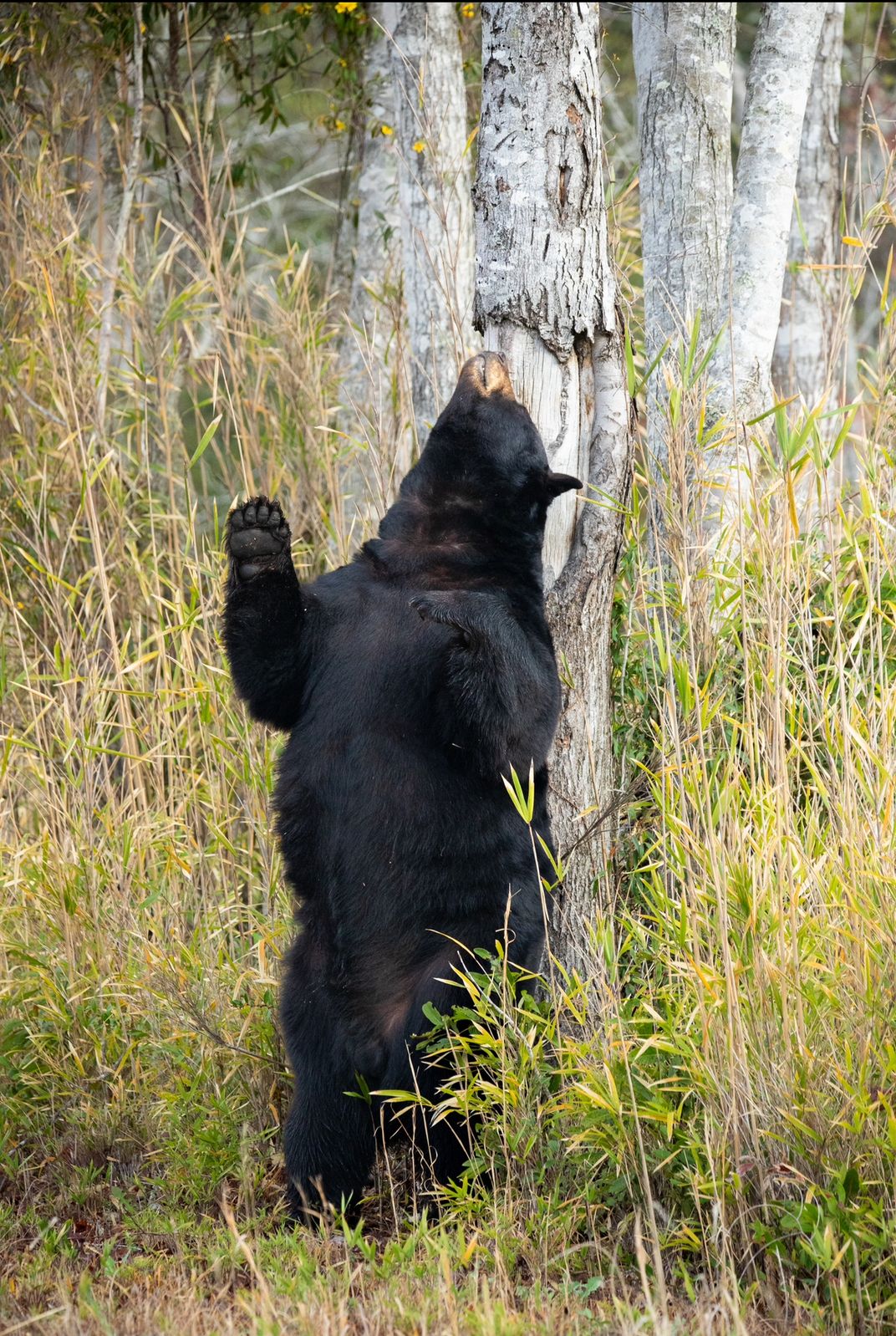 This photo depicts a black bear enjoying a back scratch against a tree. In the photo, you can tell by the torn bark that this is a common place for bears to scratch.