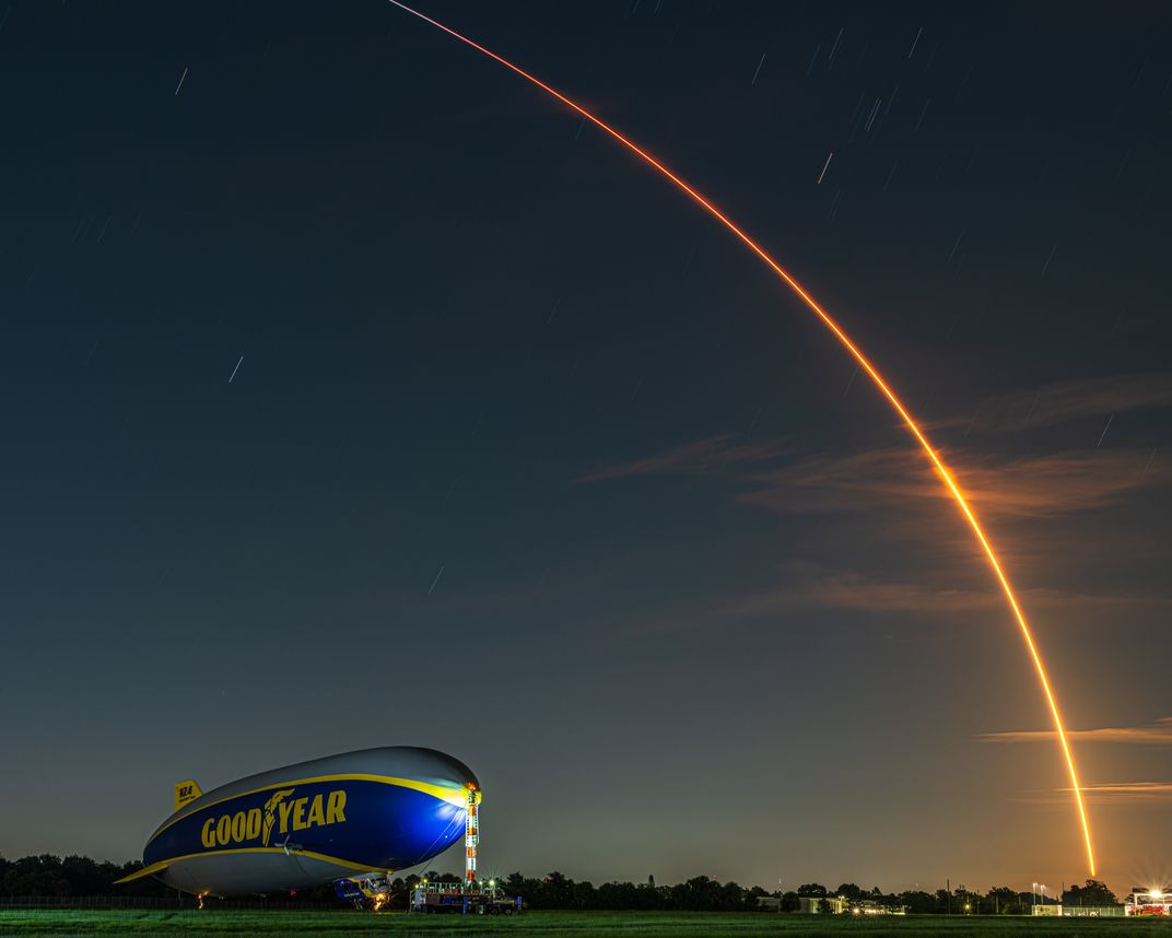 A SpaceX rocket launch rises over the Goodyear Blimp moored in Orlando, Florida. Even though everyone calls it the Goodyear Blimp, it is technically an airship. There are approximately 14 active airships left in the world.