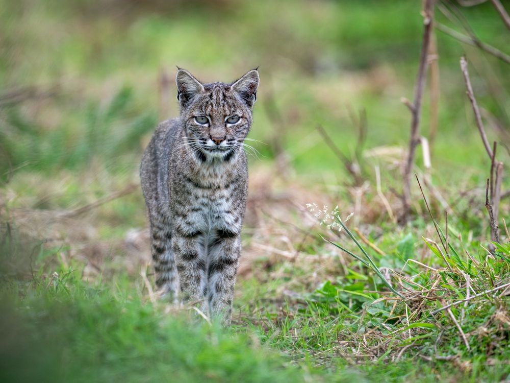 A bobcat roams the grasslands looking for food.