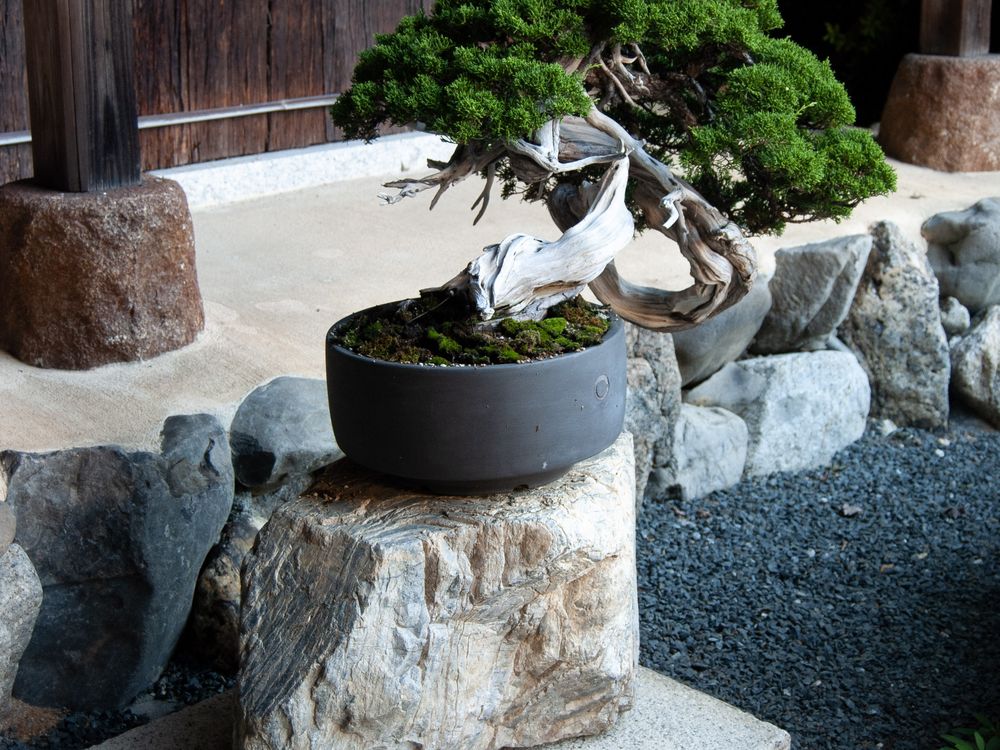 a bonsai tree in the garden of a japanese shrine