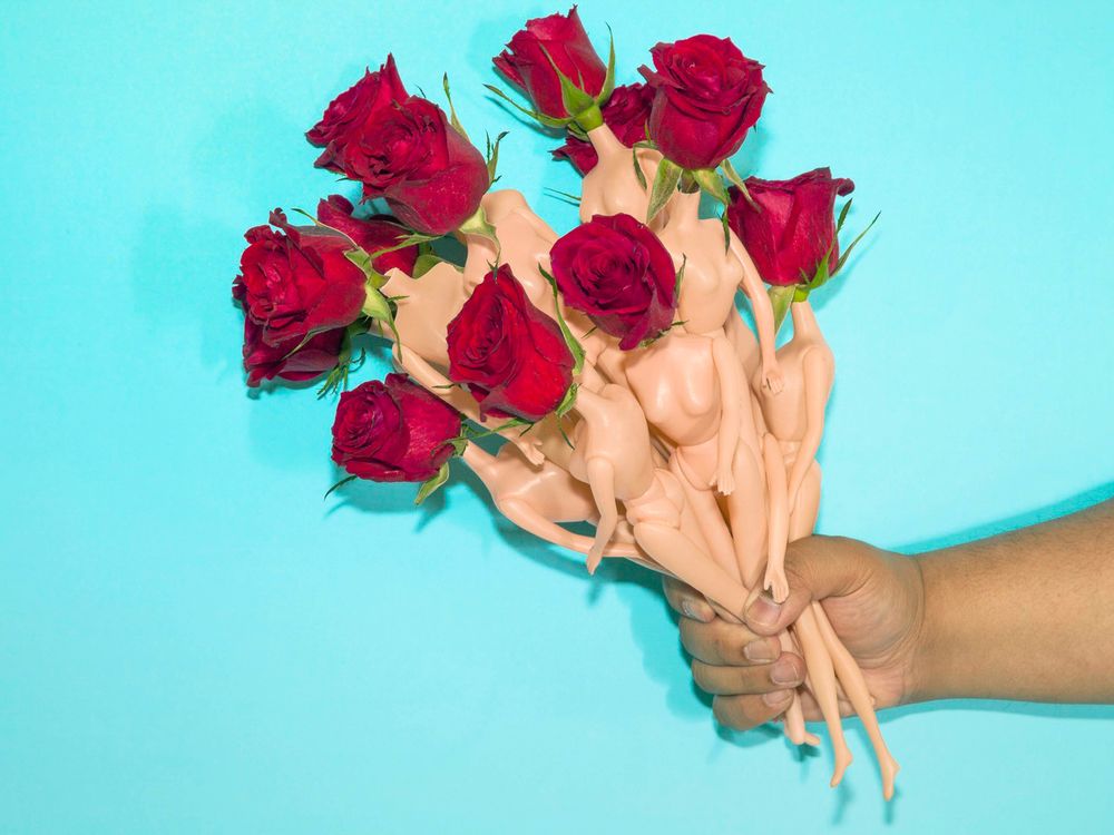A surreal arrangement of rose blooms growing from doll torsos, merging beauty and plastic form in an unsettling floral-human hybrid.
