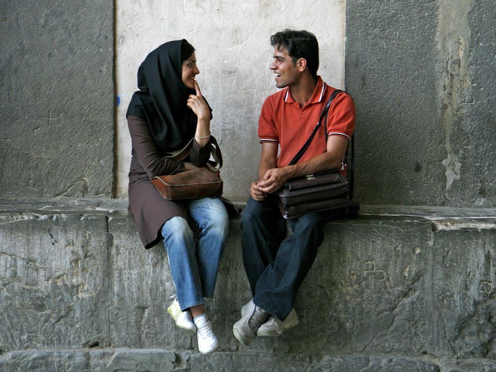 a boy and his girlfriend talking and laughing together in a historical building