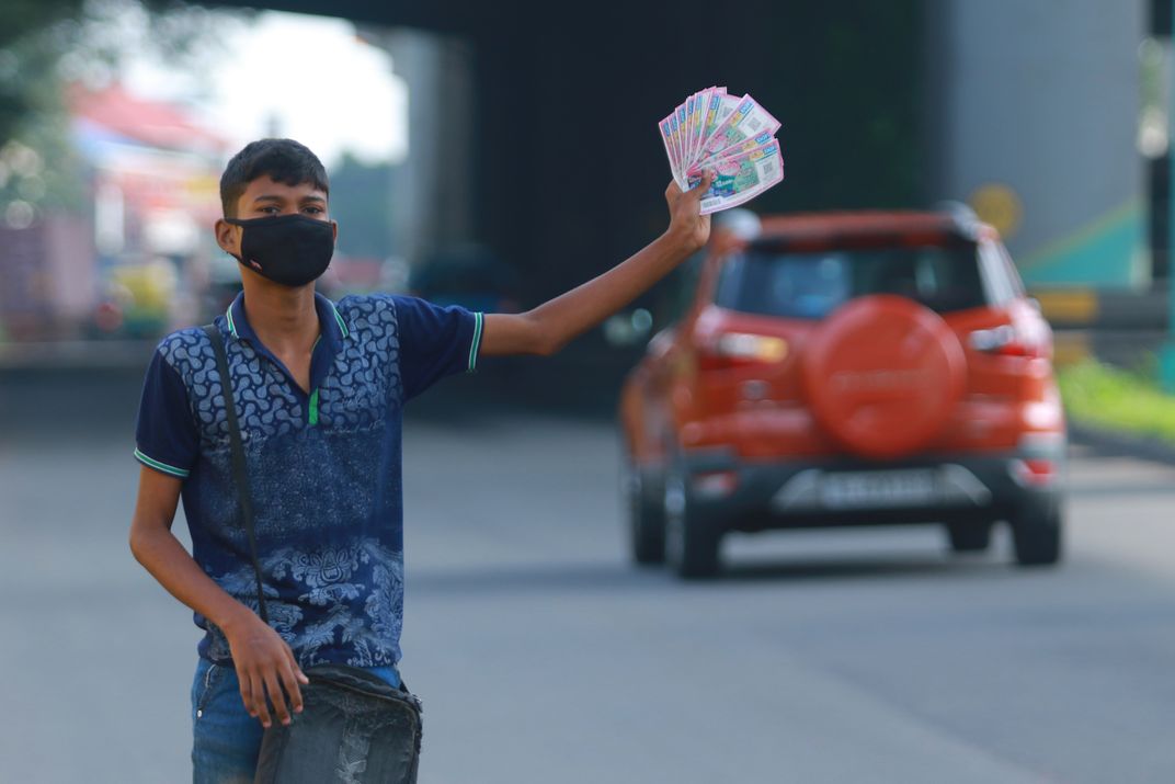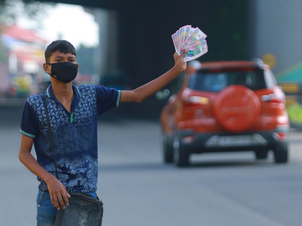 A boy selling the lottery tickets on road side..