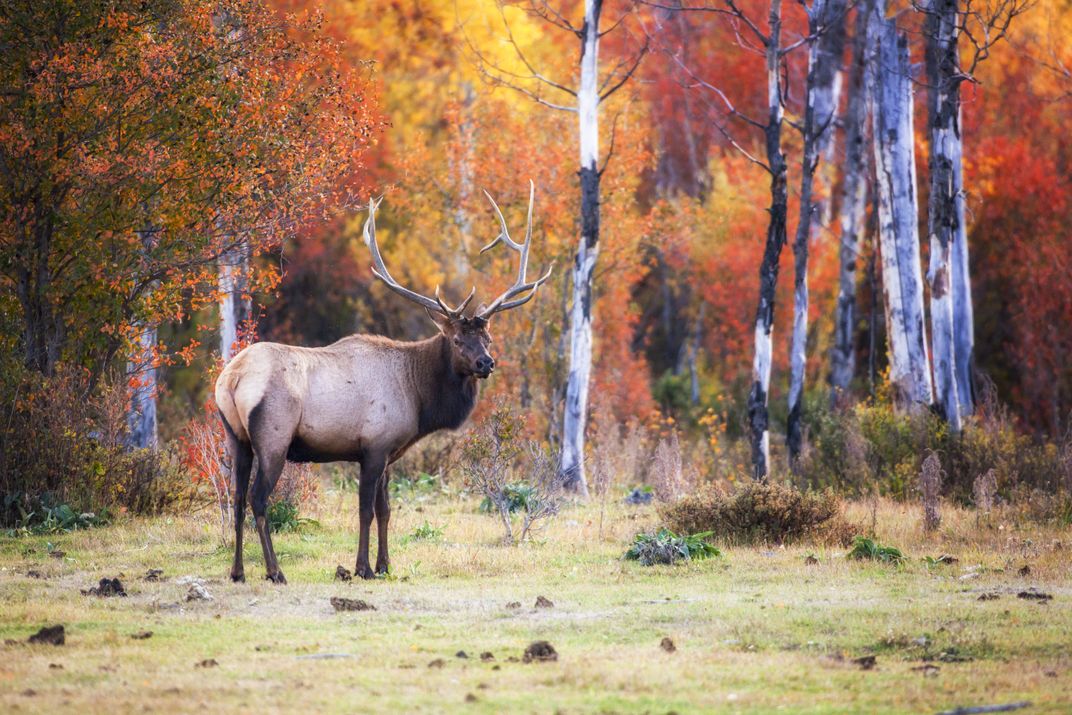A bull Elk stands amongst bright autumn leaves near Teton Village, Wyoming.