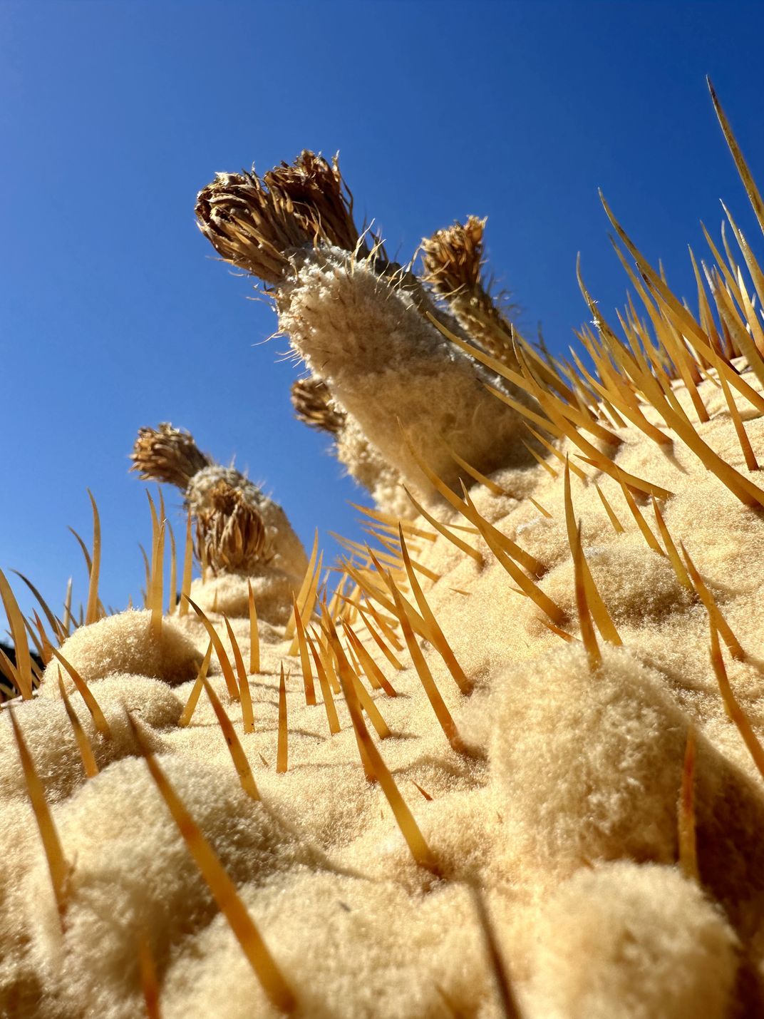 A close-up, low-angle shot of a Kroenleinia grusonii cactus at the Jardín de Cactus in Lanzarote. The cactus's fluffy crown and sharp golden spines stand out dramatically against the cloudless, deep blue sky of the Canary Islands.