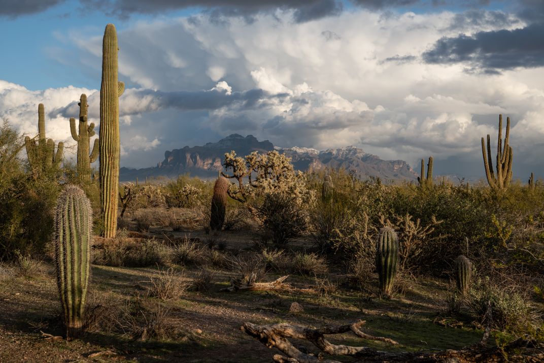 The dense cactus forests of the Sonoran Desert and the snow-covered Superstition Mountains in the far distance are covered in warm colors by the setting sun while a monstrous winter storm forms over the horizon