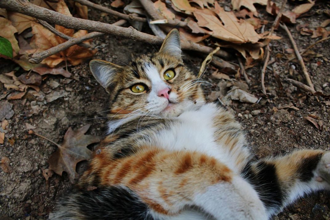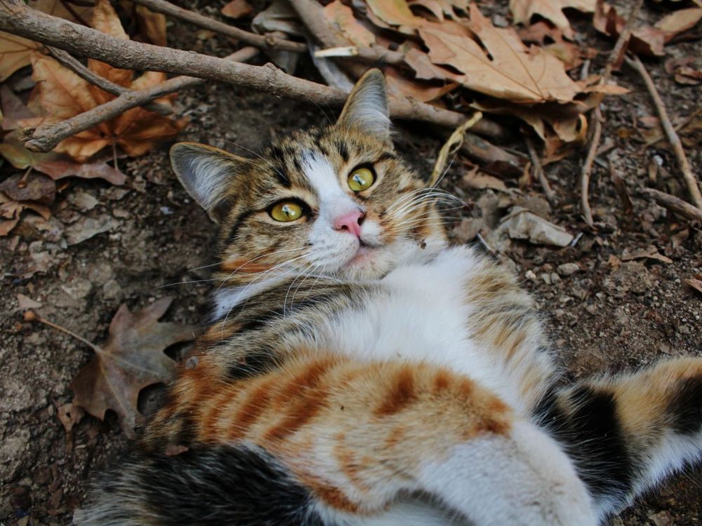 I found this cat relaxing on the ground covered with fallen leaves. Her calm pose and curious eyes show a quiet connection with the world around her.