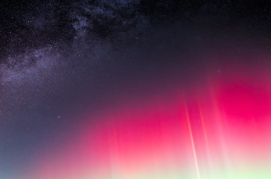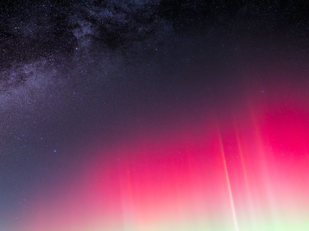 This photo shows the northern lights and Milky Way sharing the night sky together. A rare sight in West Virginia, the October 2024 solar storm brought the aurora to many places where it would normally be invisible. When the moon set below the horizon, the Milky Way appeared and for a brief time, it shared the sky witht the dancing lights of the aurora borealis.