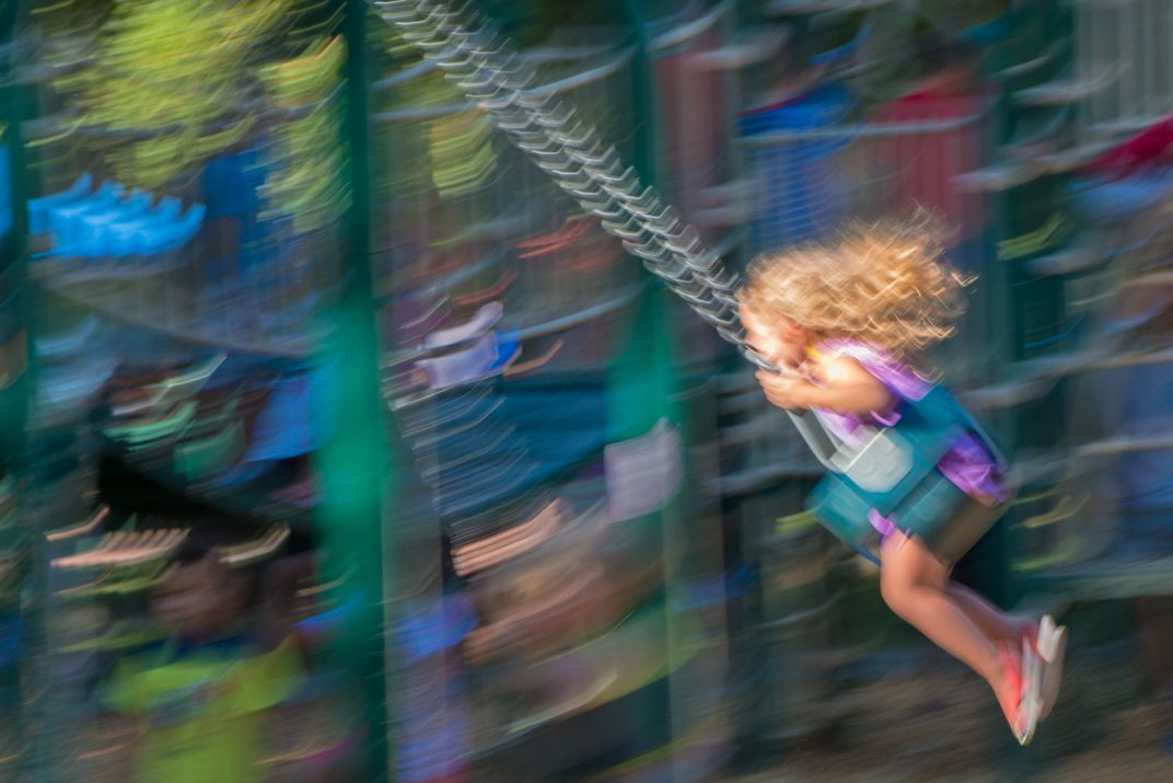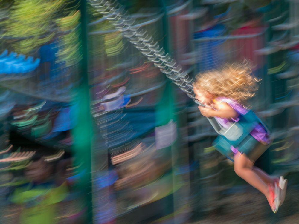 A young girl at play swings in a playground, creating a kaleidoscope of color around her.