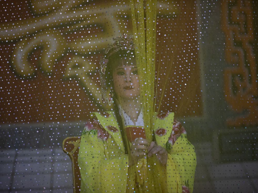 A member of traditional Chinese opera group from Guangdong stands behind the curtain when she and her friends perform in front of Chinese diaspora in North Sumatra, Indonesia.