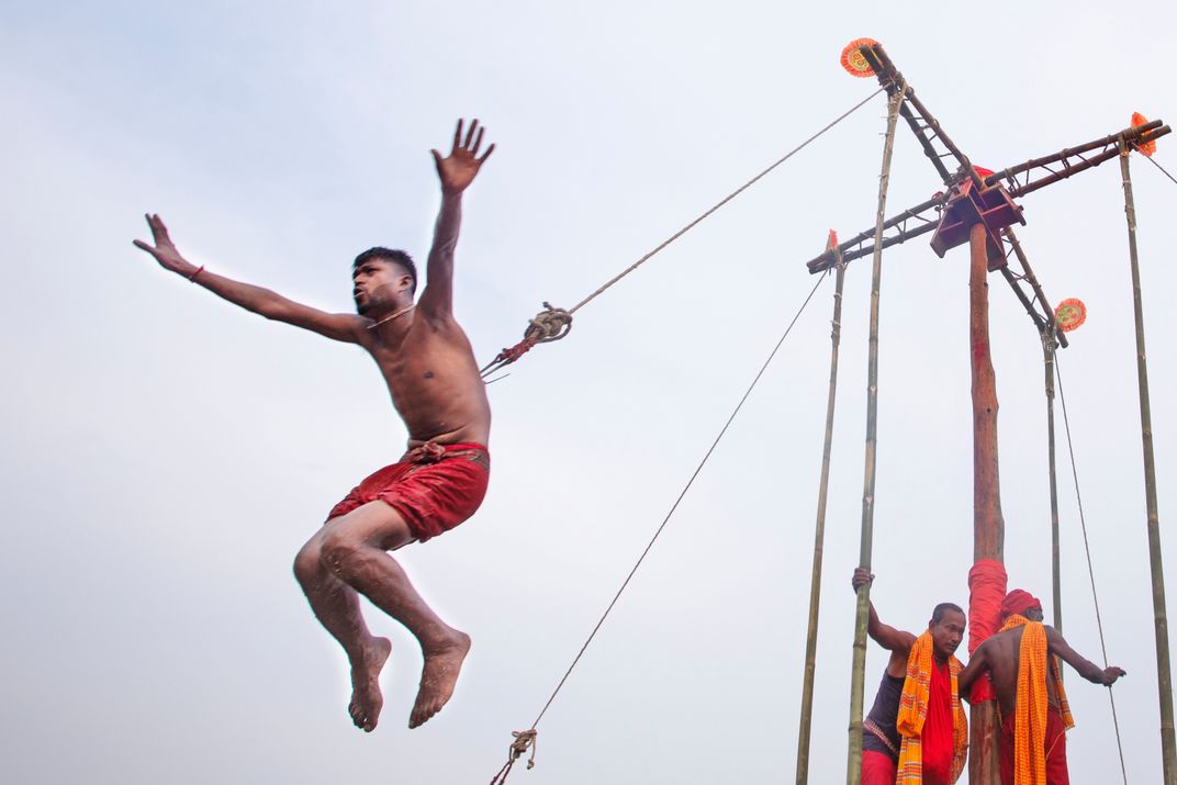 A devotee performs the Charak Puja, a traditional and daring ritual, as he leaps from the high platform. The image captures the devotion and courage of the worshippers, who dedicate themselves to their faith, embodying both sacrifice and reverence in this awe-inspiring moment.