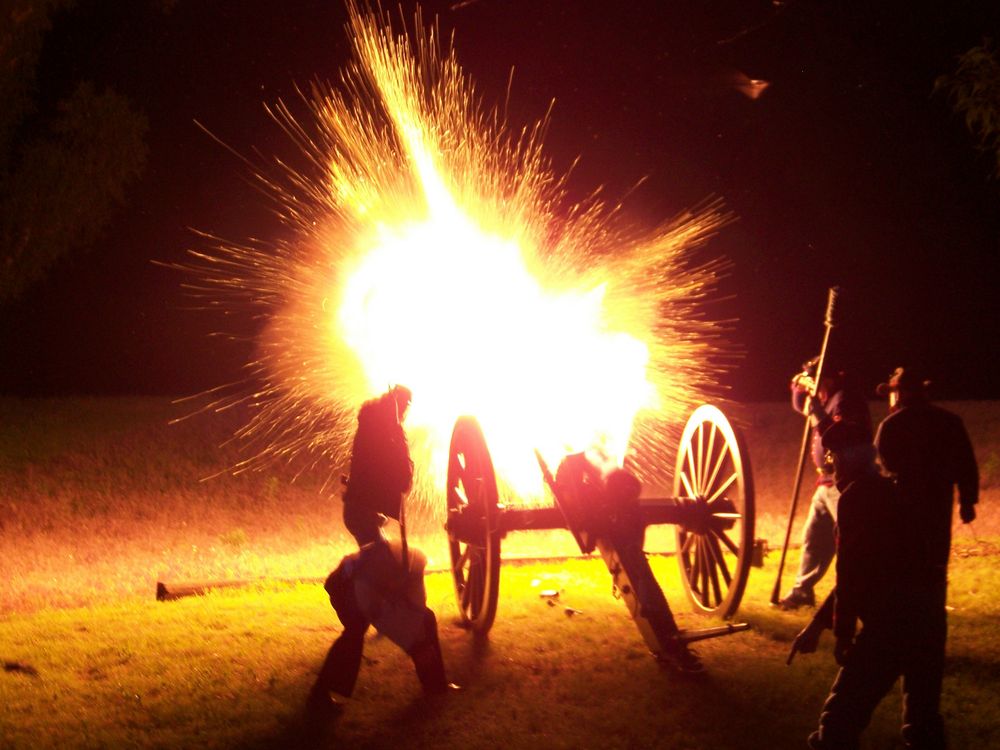 An artillery piece fires a gout of flame during a night firing demonstration. The image records the moment of firing.
