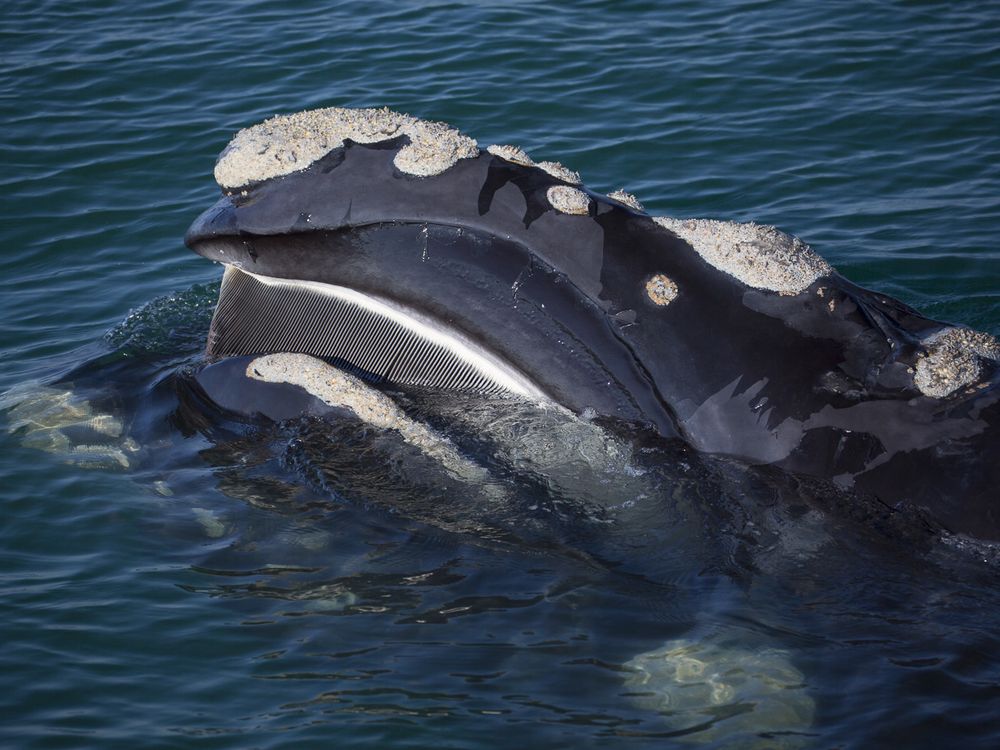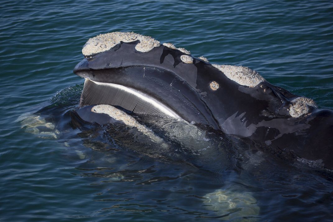 A close encounter with a Southern Right whale gave the rare opportunity of seeing the baleen filters , as it opened its enormous mouth to feed on krill.