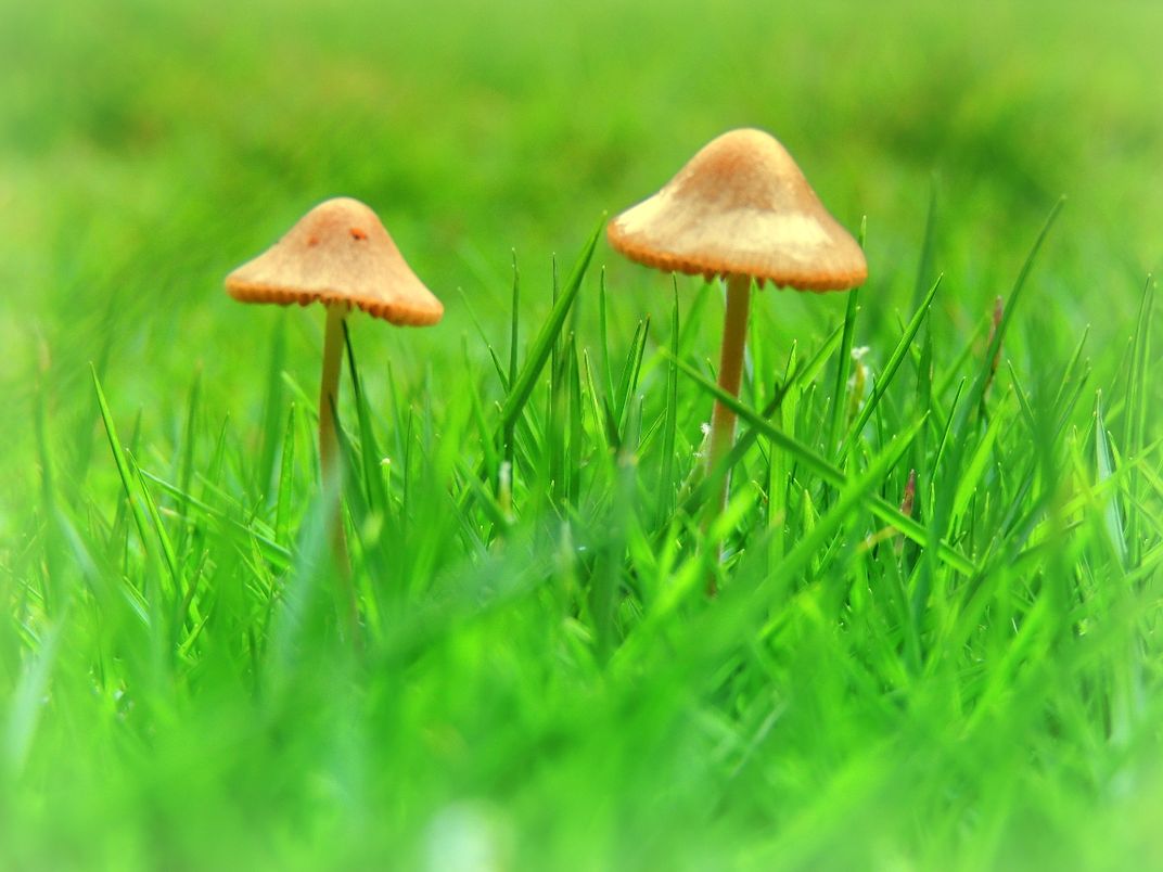 A closeup of grass and mushroom.