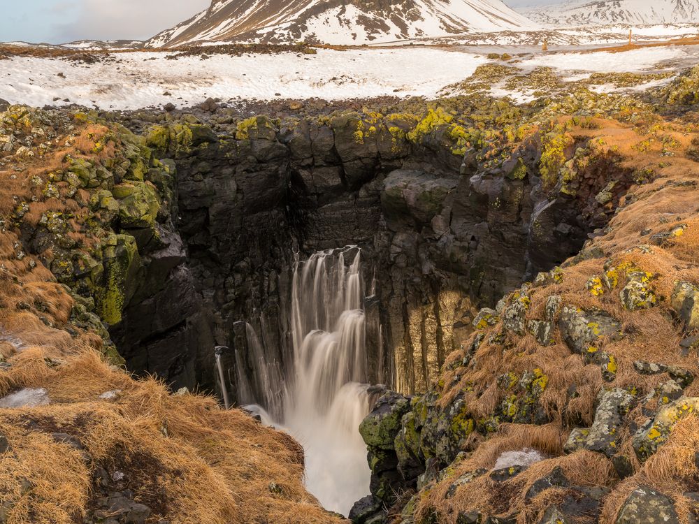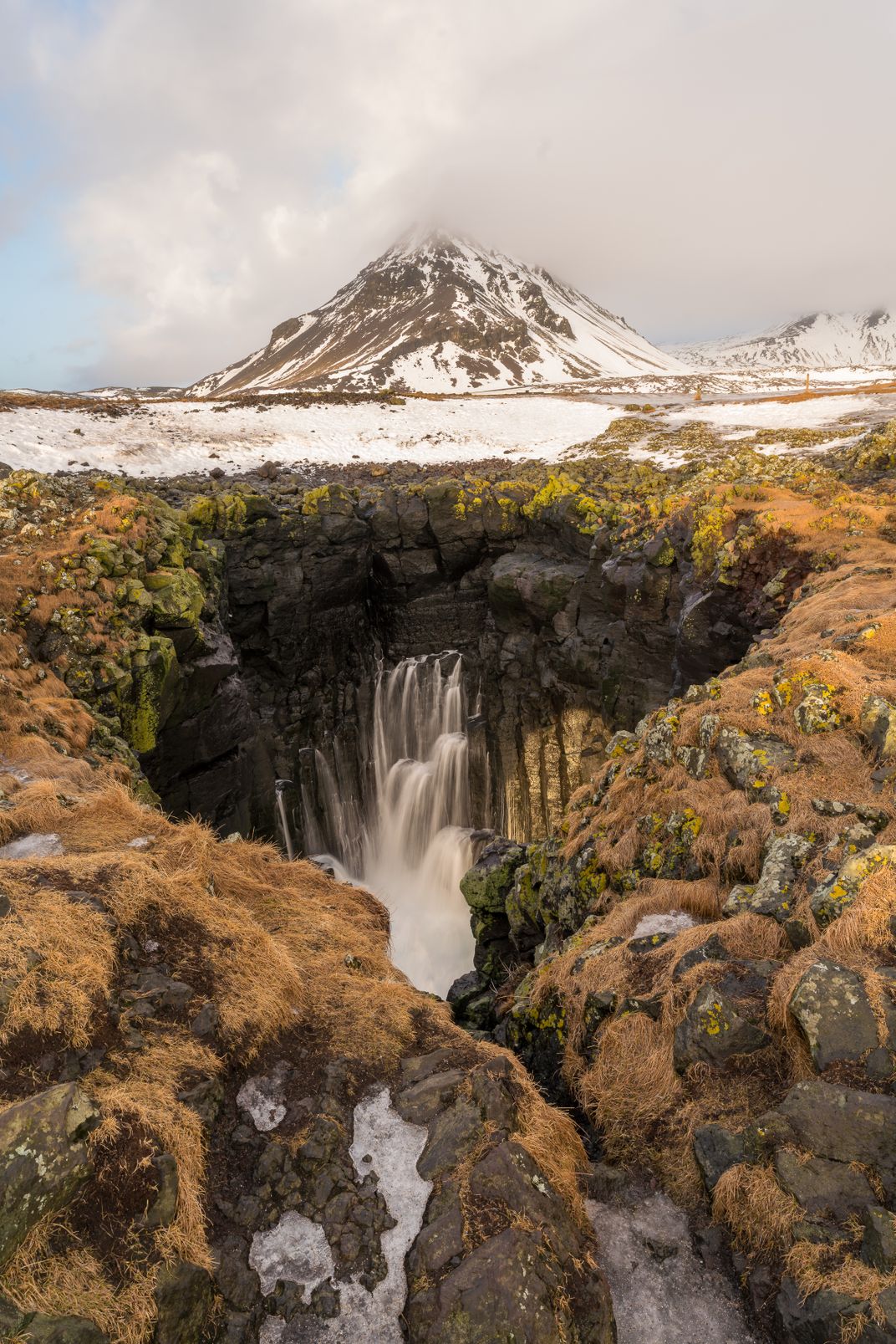 This was captured on a winter morning while exploring the beautiful Snaefellsnes Peninsula in Iceland. What appears to be a waterfall is actually the ocean crashing into a cliff. I am standing on a natural bridge opposite this basalt cliff/cavern, and the water flows beneath the bridge, crashing into the rocks and creating the appearance of a waterfall.