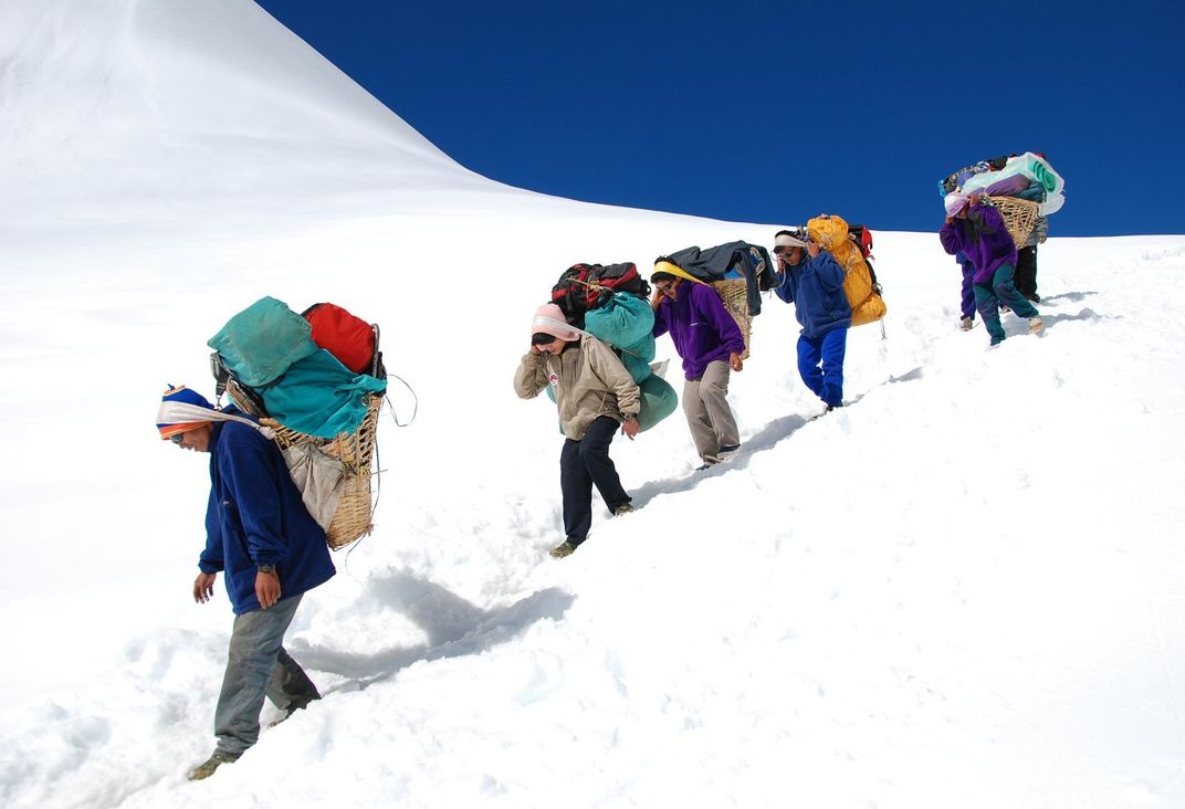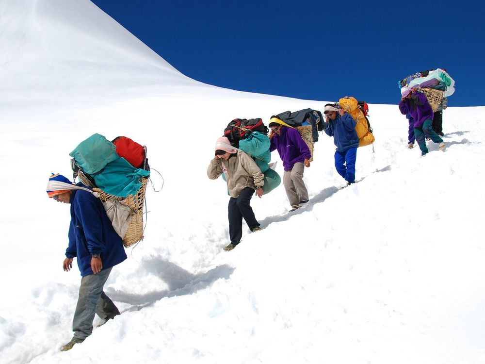 During my hike to Everest base camp, I've noticed this unique combination of a colorful group of local Nepalese carrying loaded traditional backpacks while climbing the Himalayan ridge, as well as the beautiful & well defined contrast between the pure white snow and the deep blue sky.