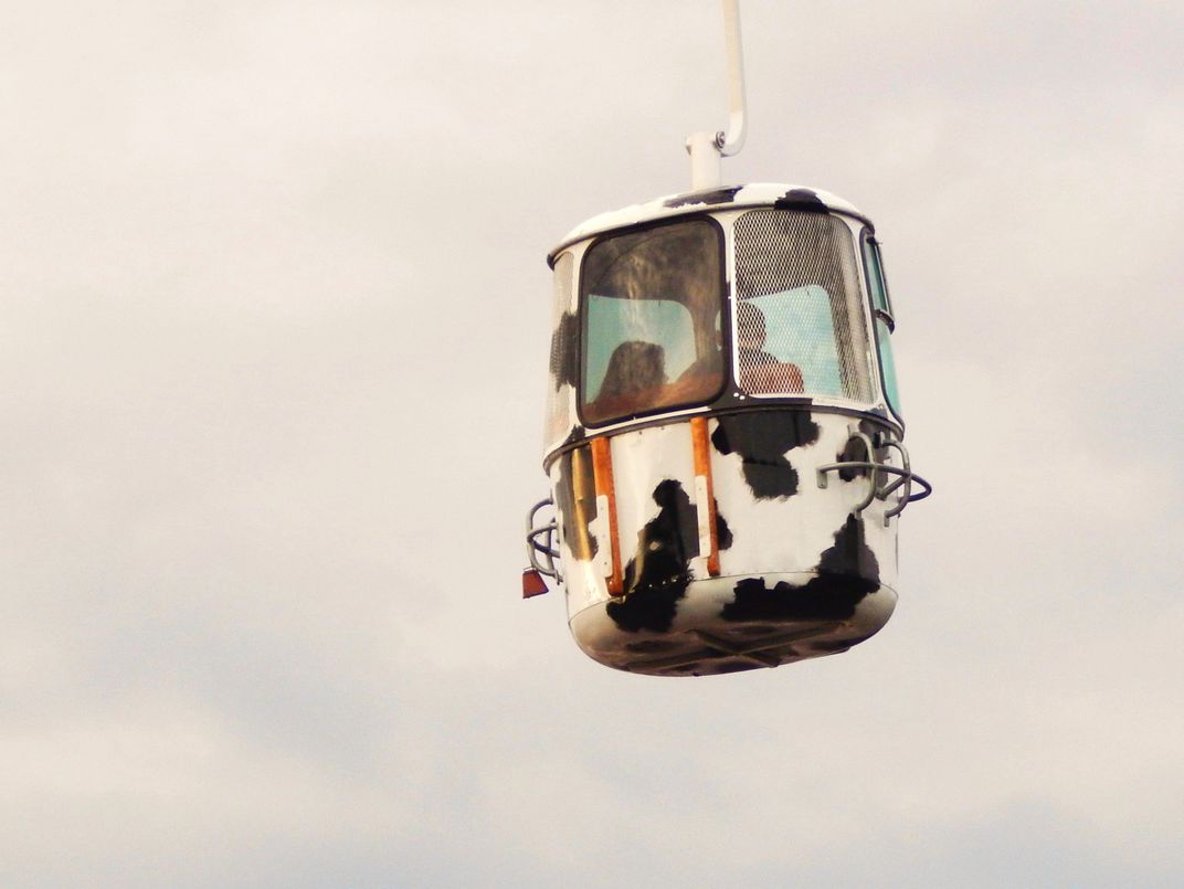 A couple ride a cow skin painted car on the Skyride across the Minnesota State Fair in 2014, the ride's 50 year anniversary.