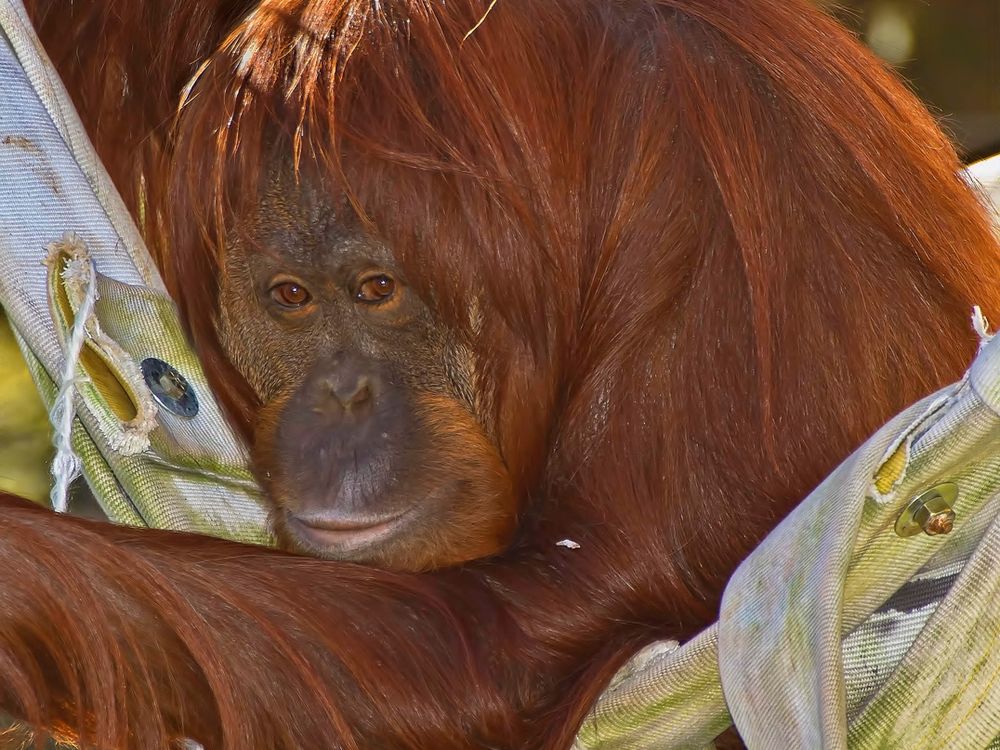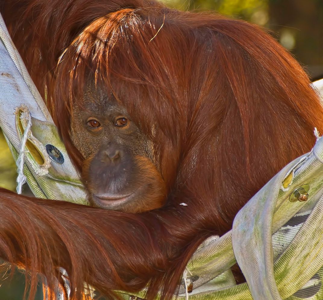 A cradled wild beauty. A female orangutan sitting in a pouch in national zoo.