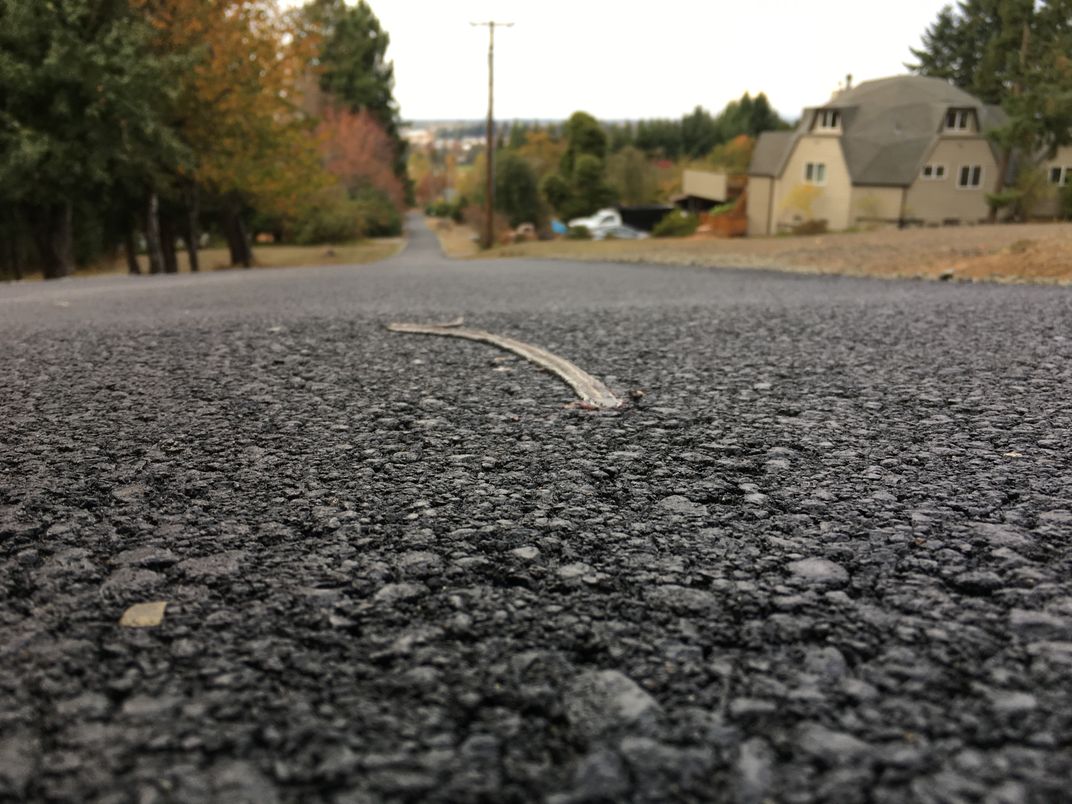 While walking home, I came across this crushed snake on the road. I felt bad for him, but I did think the angle and perspective was interesting.