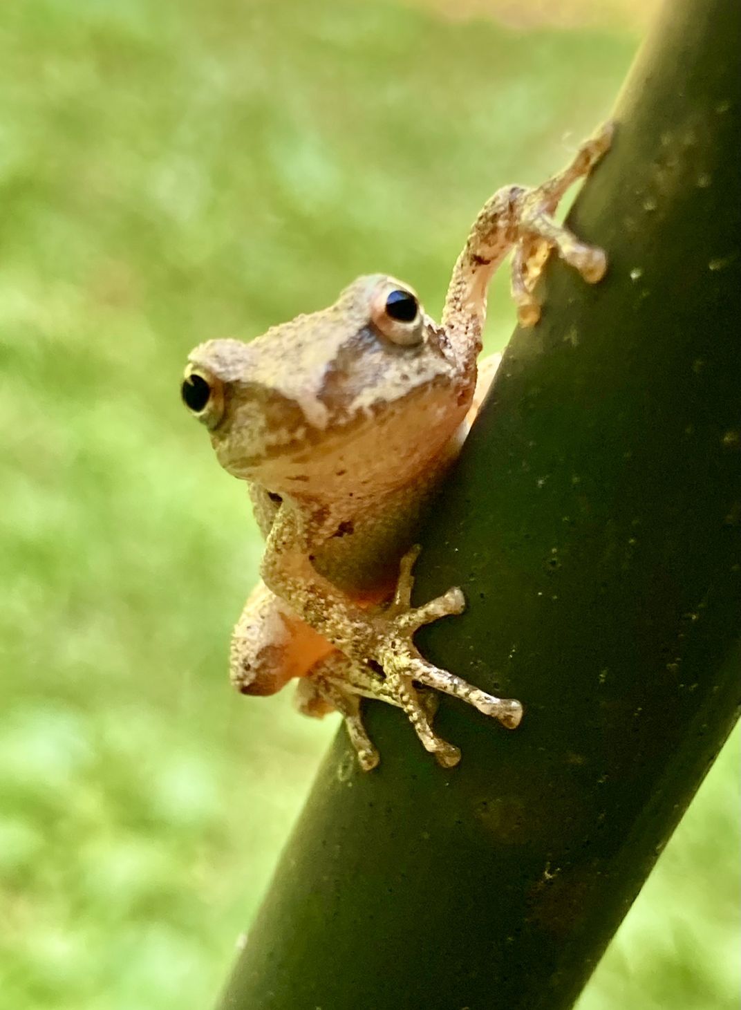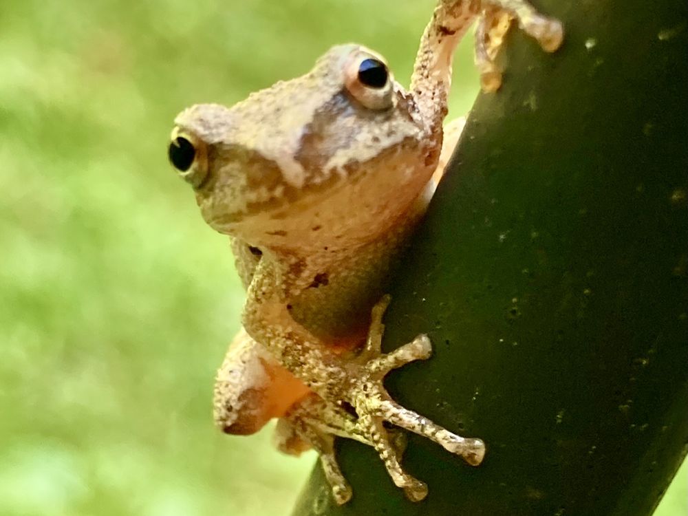 I saw this tiny little tree frog watching me pull weeds this summer