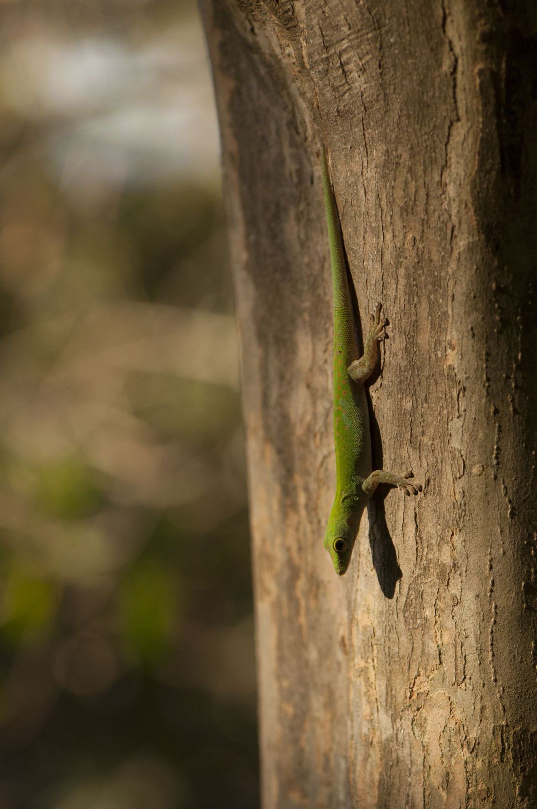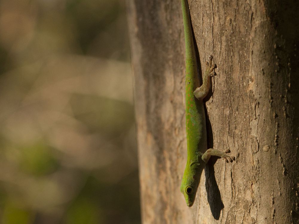 A day gecko (Phelsuma spp.) basking in the sun.