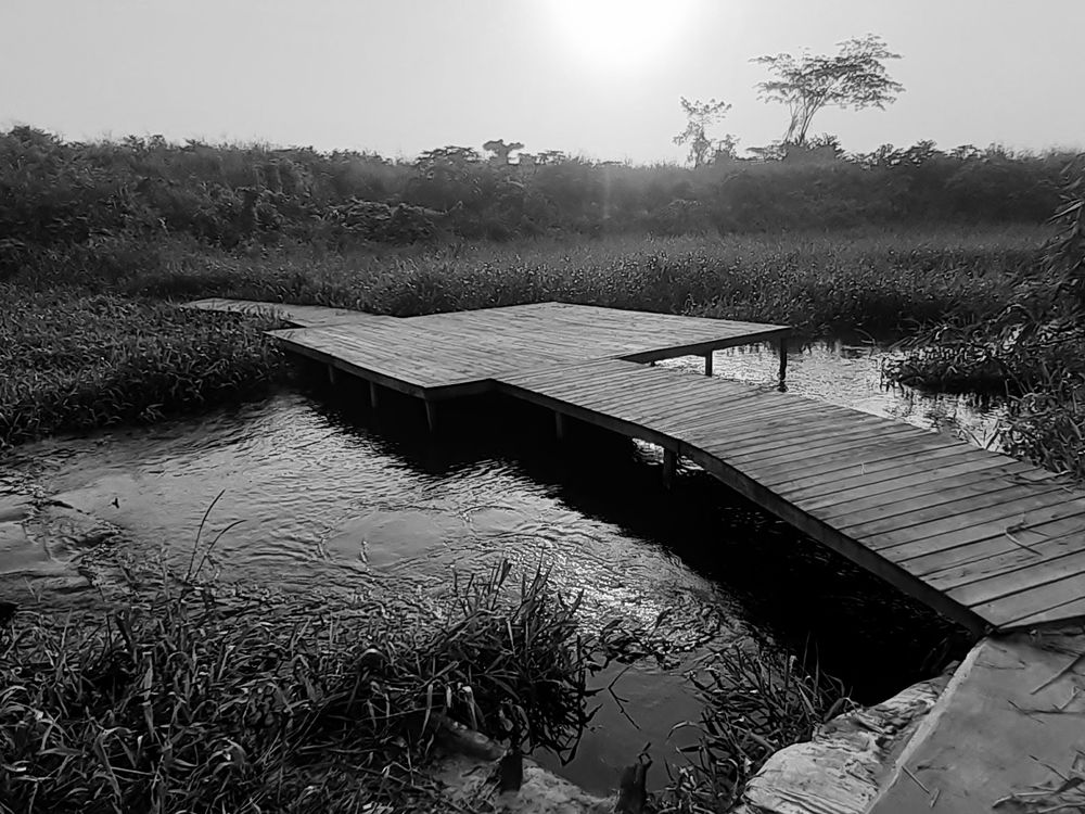 A private fishing dock, built by a local carpenter, sits over a natural creek that feeds into a large swamp. Captured at sunrise to highlight the stillness and contrast between the manufactured structure and the wild, natural landscape.